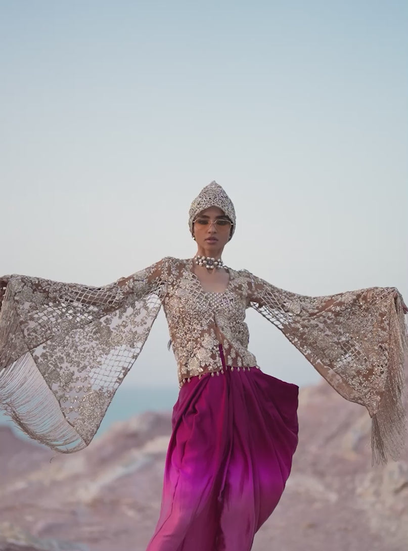 The look features a stunning farshi dhoti in a vibrant plum-to-magenta ombre, cinched at the waist by an architectural, mirror-encrusted belt that provides a sharp, brilliant contrast. Over this, a meticulously crafted lace jacket in antique gold is draped, featuring dramatic cascading fringes that create a mesmerizing play of light and shadow with every movement. Finished with a sequined crop-top that glimmers like moonlight on water, this ensemble is designed for the high-fashion visionary who seeks to combine regal tradition with a spirited, contemporary edge.