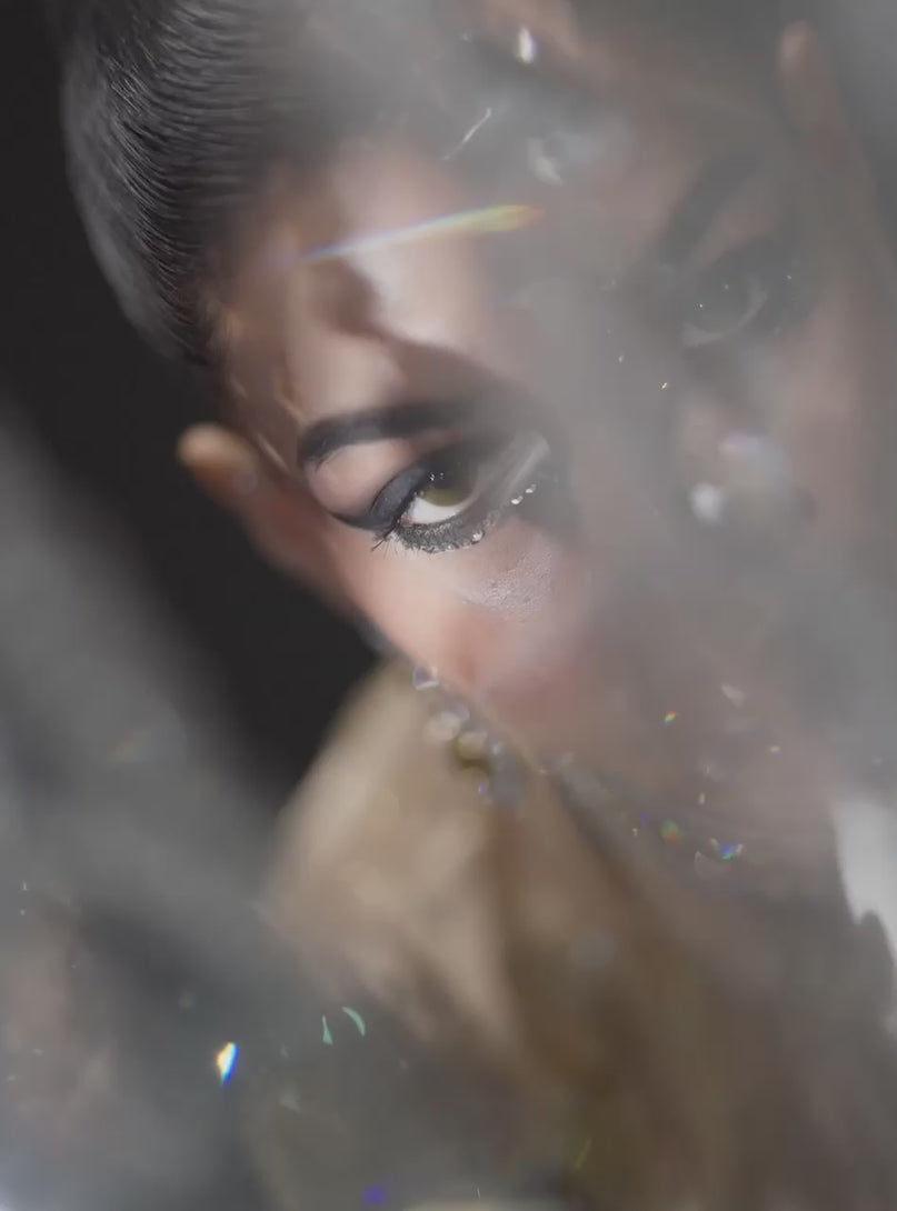 The Aurore d'Or ensemble features a resplendent floor-length long coat crafted from shimmering metallic gold fabric, exquisitely hand- embellished with delicate tonal mukesh work scattered across the garment, mimicking a soft, ethereal light; the design is anchored by an intricate tapestry of grand, traditional motifs rendered in rich maroon and bronze embroidery along the luxurious hemline, offering a striking, opulent contrast against the flowing gold, and is perfectly paired beneath with a luxurious raw silk maroon trouser and a heavily embellished velvet bustier, adding captivating jewel-tone depth and texture to this regal look.