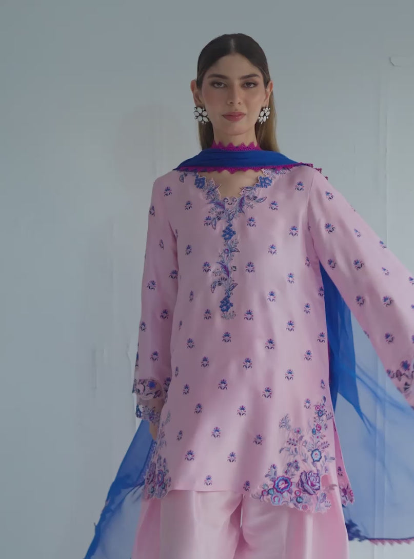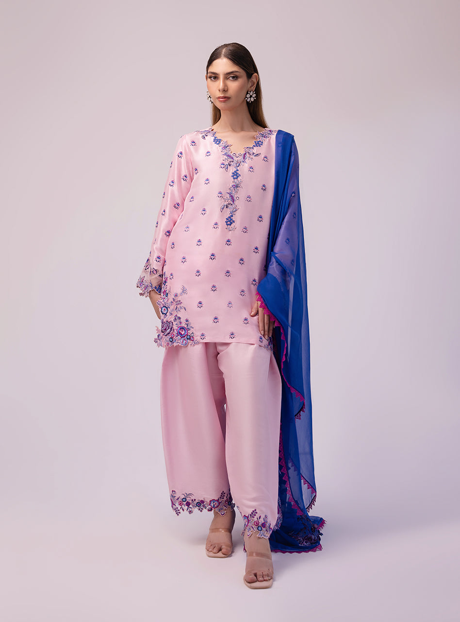 Ayza, this charming three-piece outfit features a powder pink raw silk shirt with beautiful blue and purple embroidery on the front, including a detailed V-neckline and stylish cut-out hem. It comes with comfortable raw silk shalwar that have matching embroidery on the cuffs. The ensemble is completed with a vibrant royal blue chiffon dupatta.