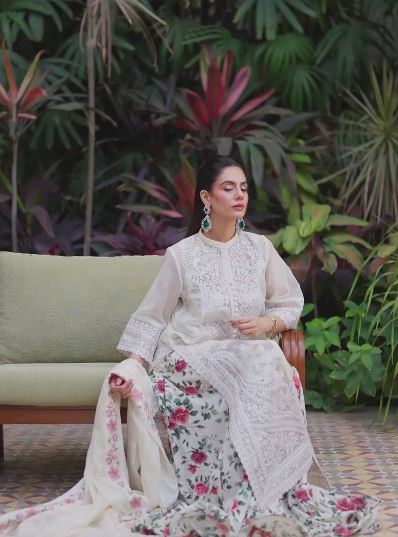 This stunning ivory ensemble features a sheer khaadi net, long-line tunic layered over a voluminous floral-printed Inner gown. The shirt is a canvas of exquisite tone-on-tone white embroidery, showcasing a regal central panel and dense, architectural borders at the hem that create a textured, high-fashion look. The wide, mid-length sleeves are finished with a matching lace trim, perfectly complementing the delicate floral inner gown that peek through in shades of crimson and forest green. The ensemble is completed with a draped ivory dupatta, featuring a matching floral-and-lace border that ties the entire garden-inspired look together with effortless sophistication.