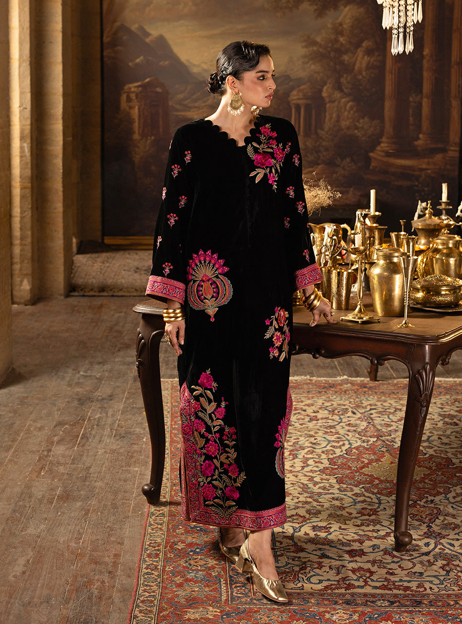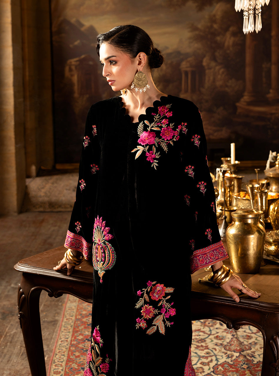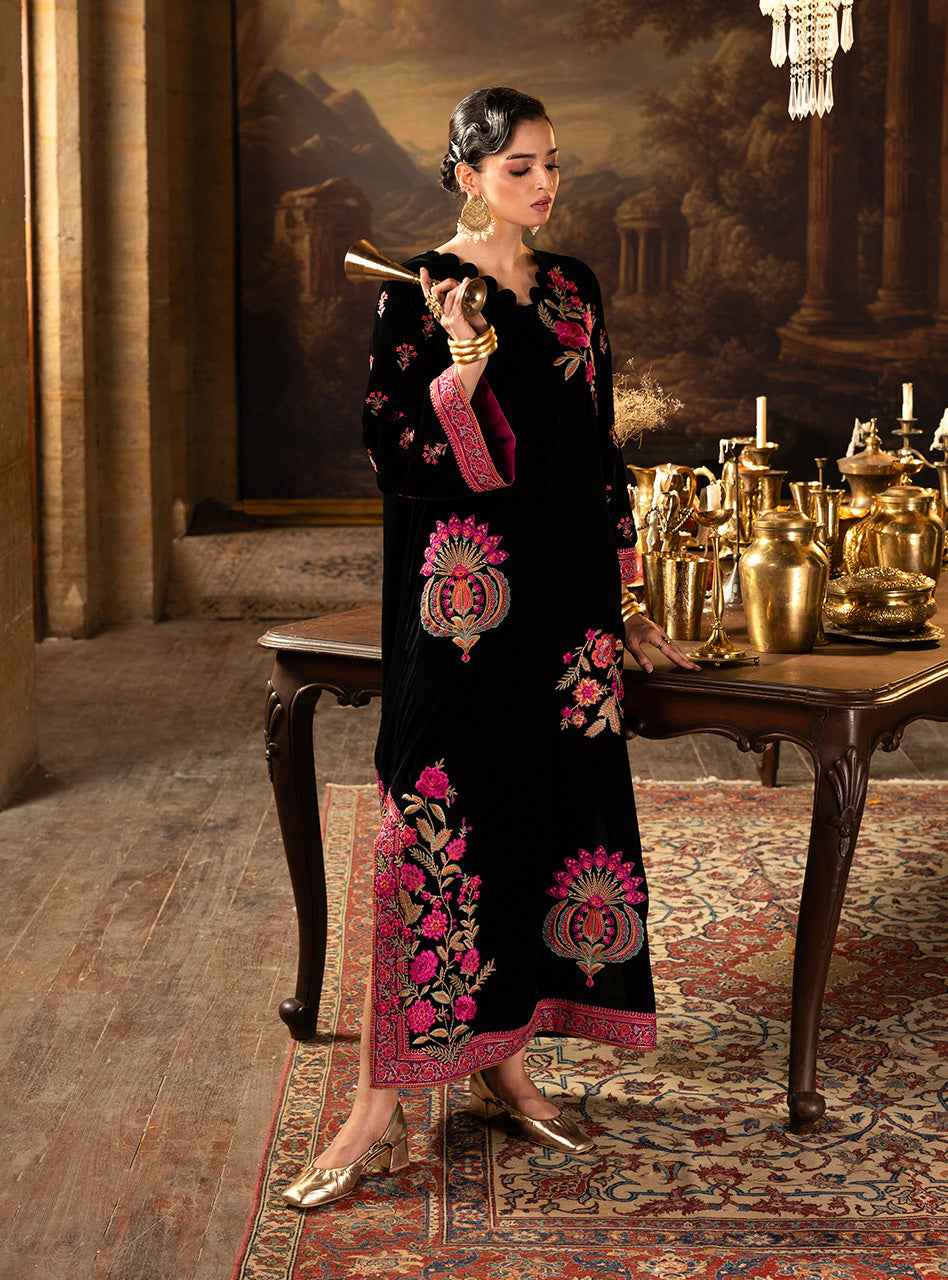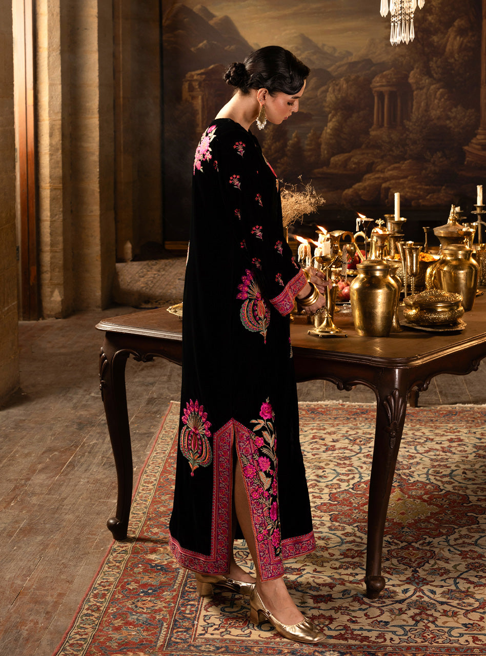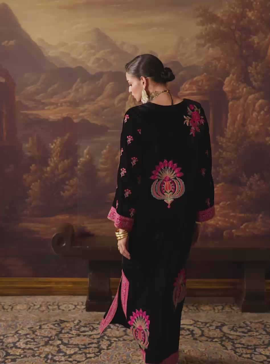 Make a vibrant, unforgettable statement with Belle Kaftan. This piece takes the ultimate classic, plush Black Velvet, and transforms it with a joyous burst of color, giving you an immediate feeling of confident energy. The rich, deep fabric is spectacularly adorned with bold fuchsia and magenta embroidery in a striking, artistic folk pattern that beautifully highlights the neckline, sleeves, and extended hem.