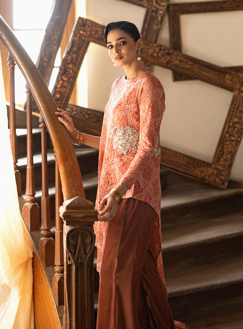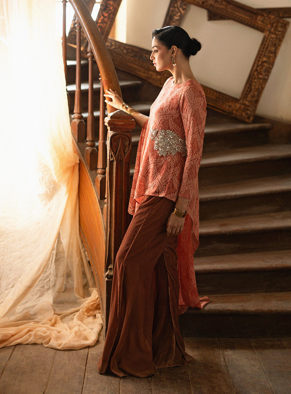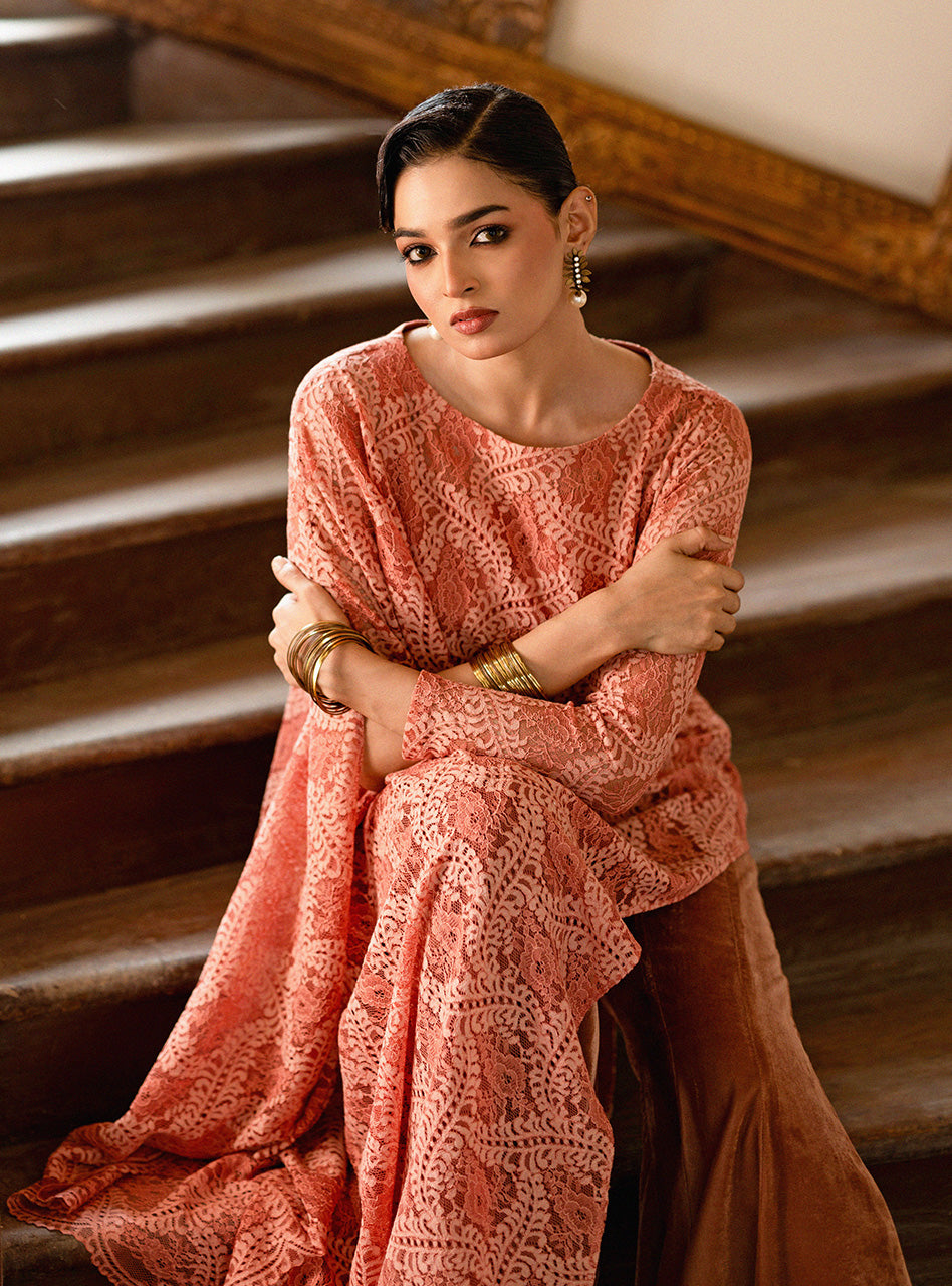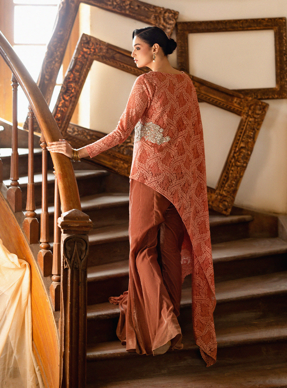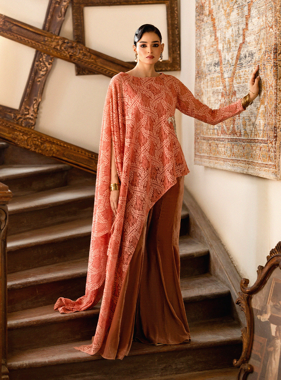 An outfit that makes you feel instantly light, confident, and utterly sophisticated. The top is cut in a fluid, cape silhouette from a delicate Blush-Toned Chantilly Lace which drapes beautifully and gives your movement an ethereal quality. This soft texture is elegantly grounded by a striking silver hand-embellished, placed to define your waist with a precious shimmer. Paired with perfectly tailored flared trousers in a rich, complementary rust tone.