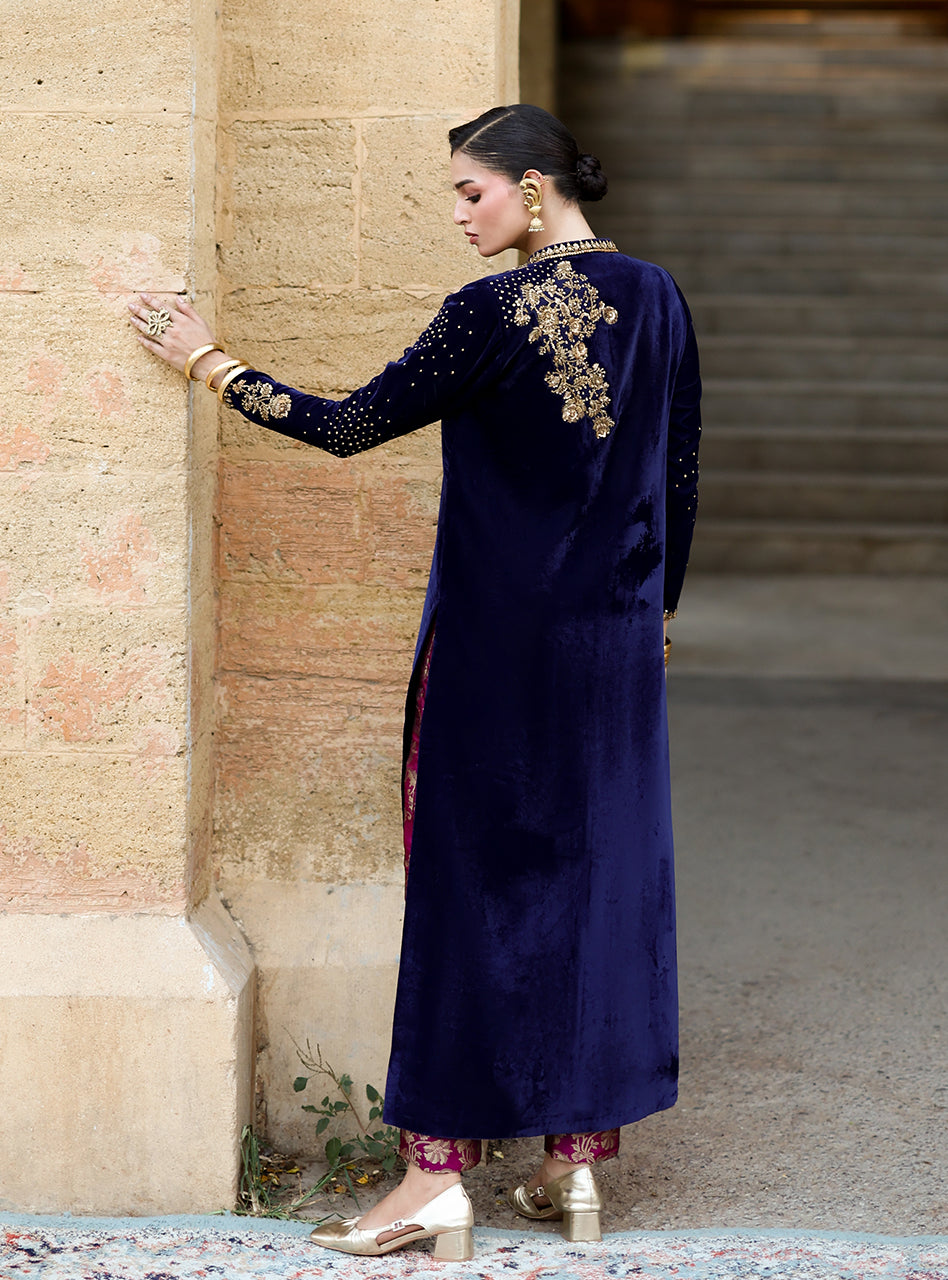 An ensemble that makes you feel like royalty, draped in magnificent beauty. Crafted from the most exquisite Deep Navy Blue Velvet, this piece offers a silhouette of sophisticated grace, with a luxurious weight that feels truly special. The magic unfolds in the breathtaking hand-embellished details: intricate gold dabka and delicate stones cascade across the neckline, sleeves, and side panels, sparkling with an artisanal brilliance that speaks of heirloom quality. Paired with luxurious jamawar trousers in a rich fuchsia-gold print, and a sheer organza dupatta with jamawar borders
