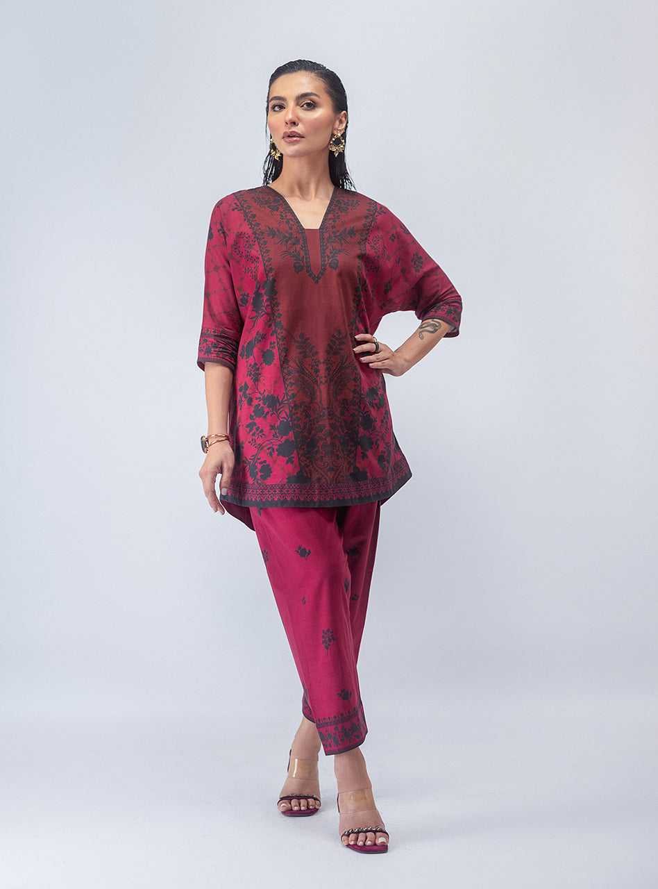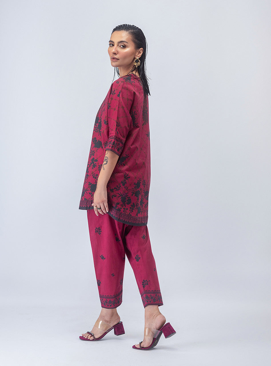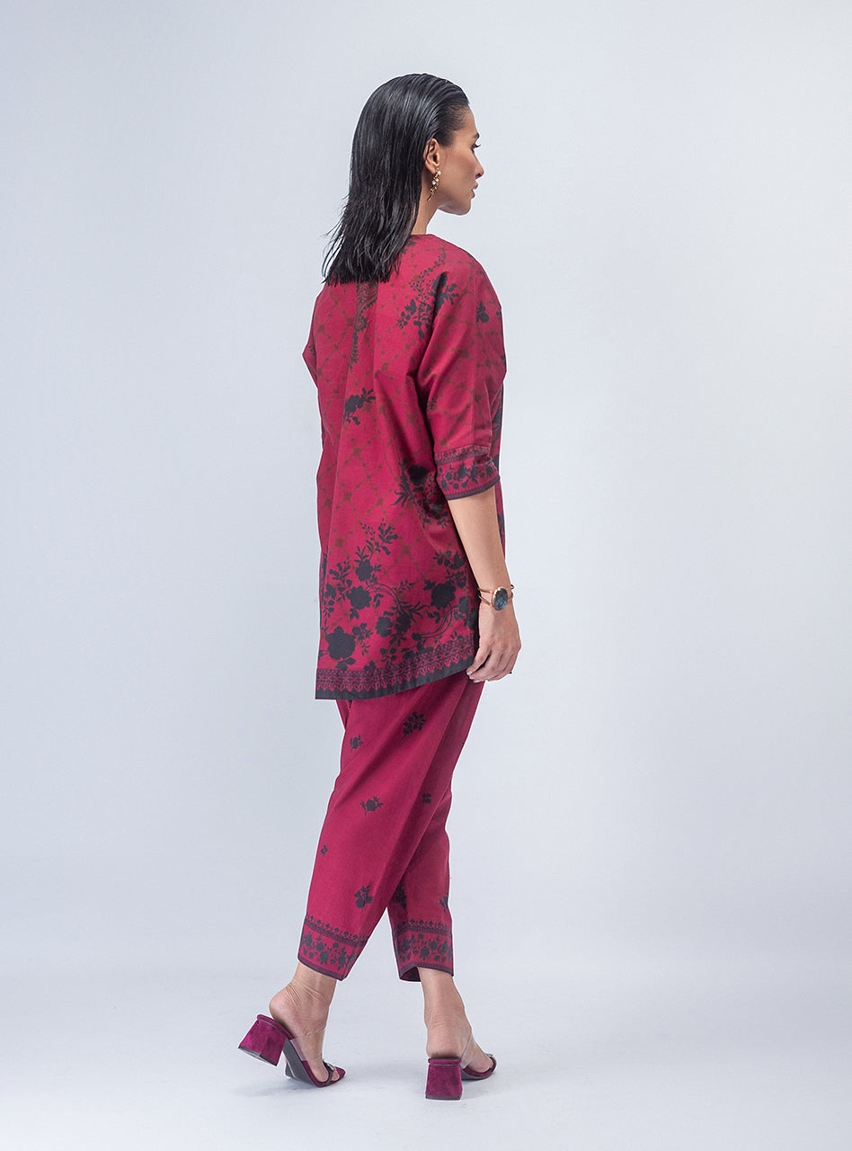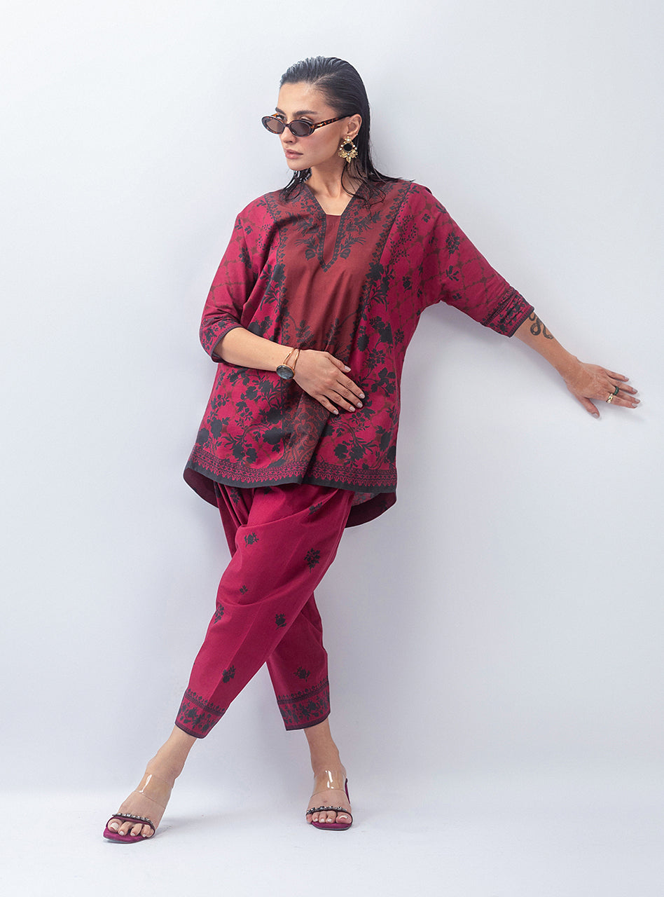This printed lawn matching set is a whole mood, featuring a vibrant maroon red short...