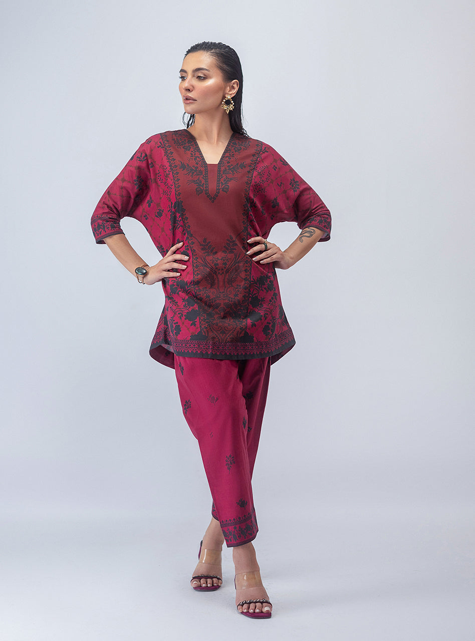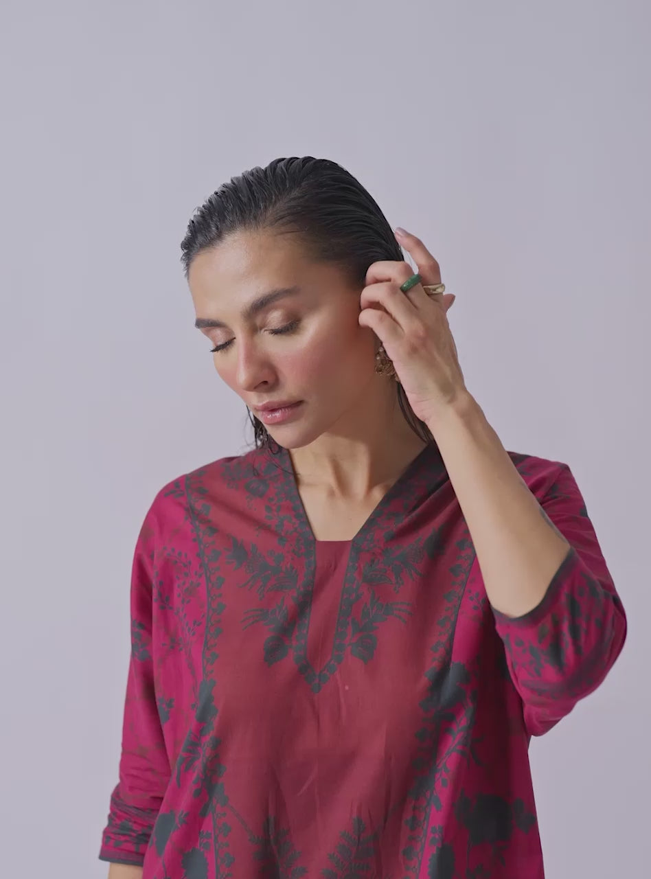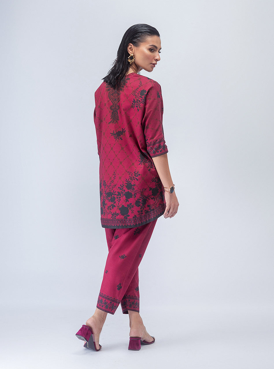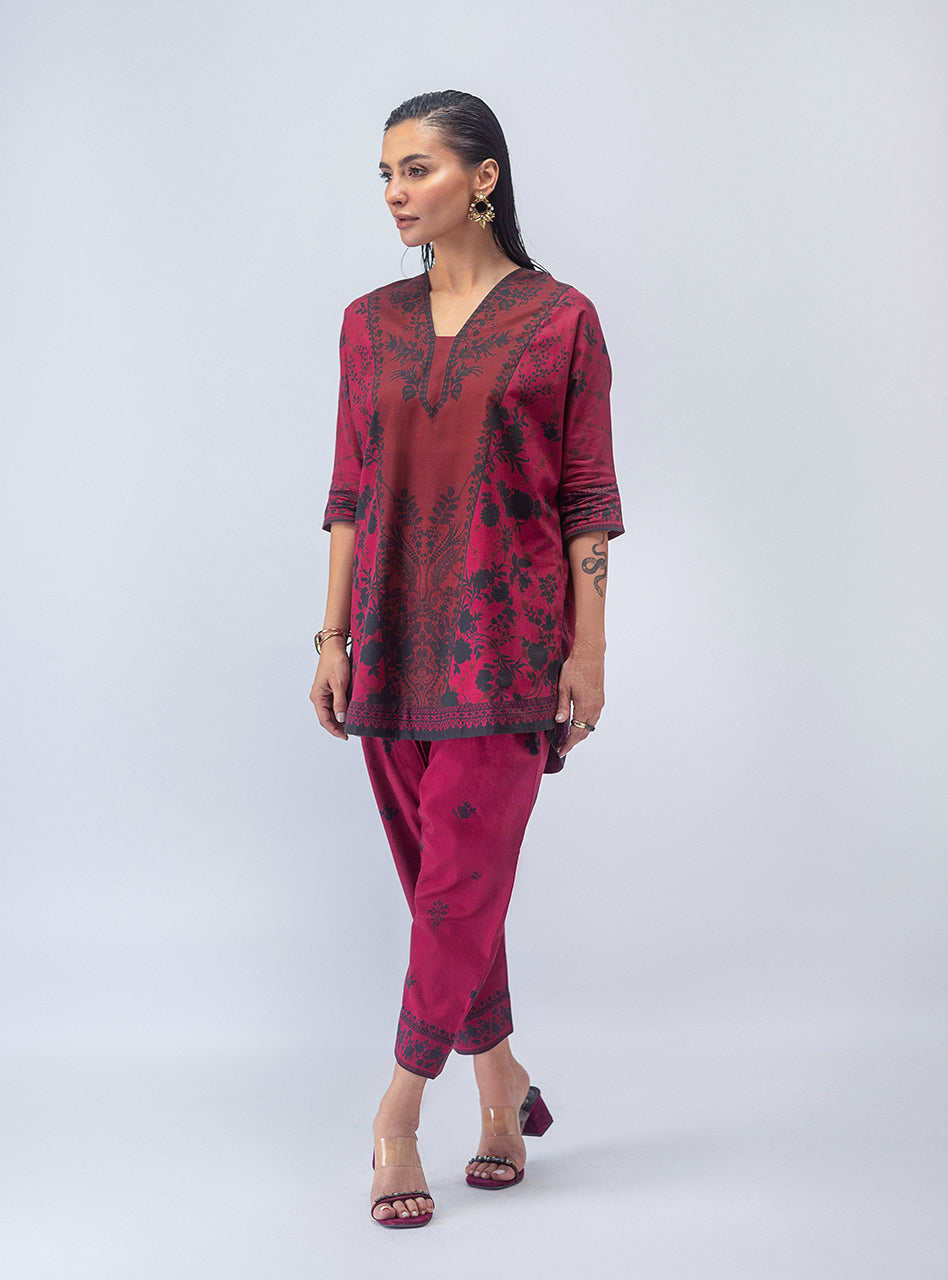This printed lawn matching set is a whole mood, featuring a vibrant maroon red short...