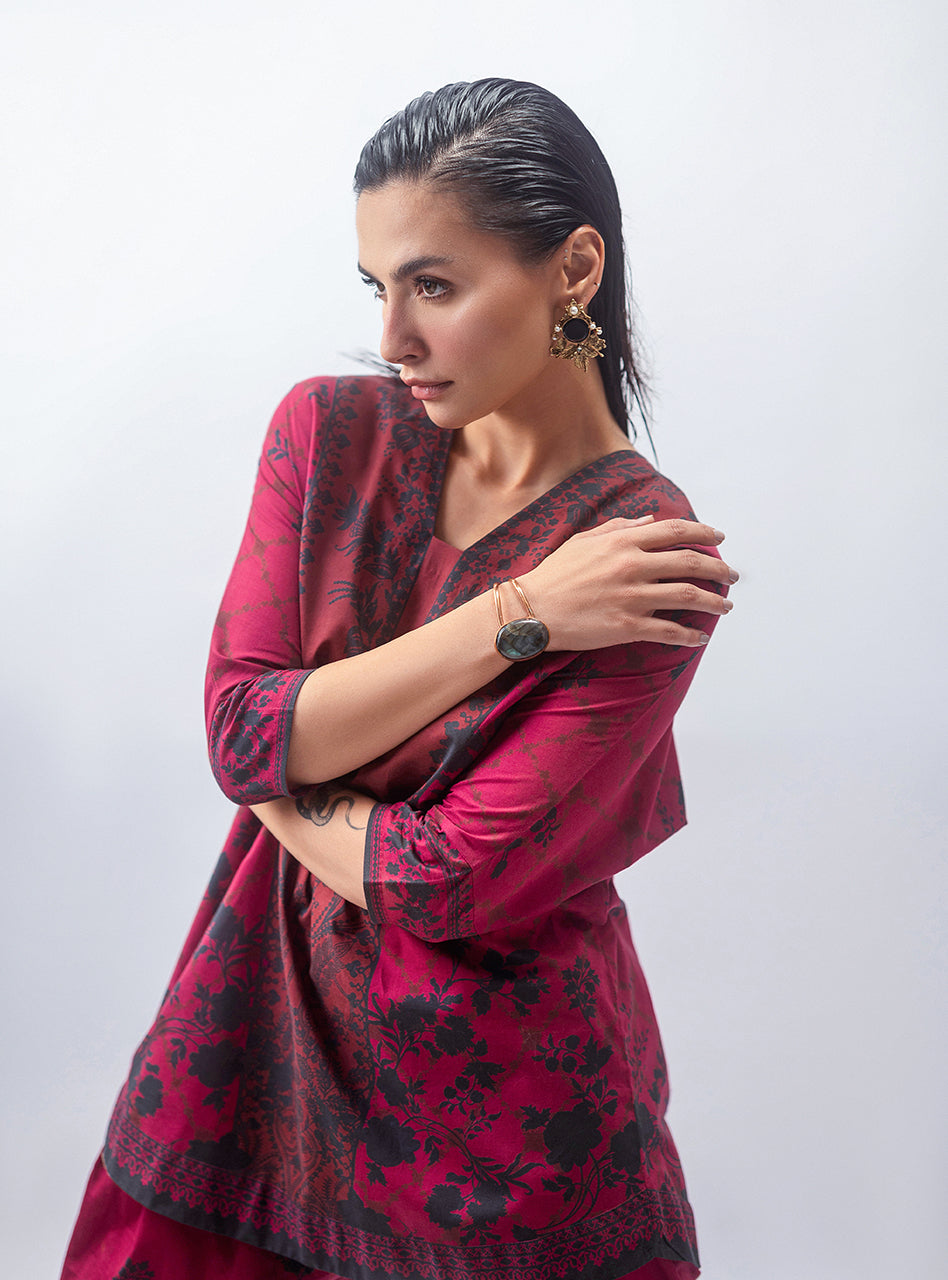 This printed lawn matching set is a whole mood, featuring a vibrant maroon red short shirt and matching shalwar. The cool, contrasting print pops against the rich color, giving it that effortless, artsy vibe. It’s comfy enough to chill in all day but stylish enough to make a statement wherever you go. Get ready to turn heads and feel amazing – this drop is a definite must-have!