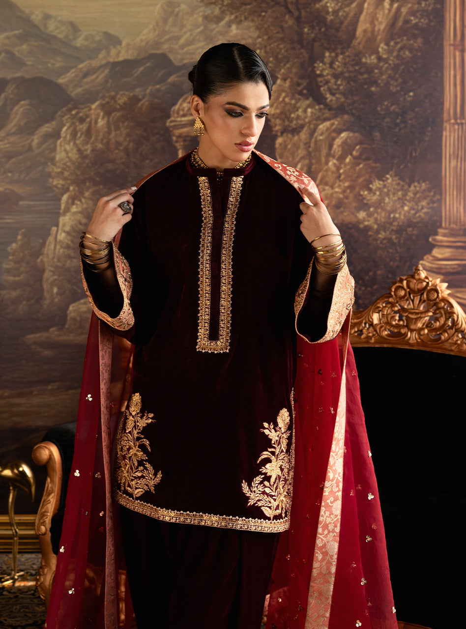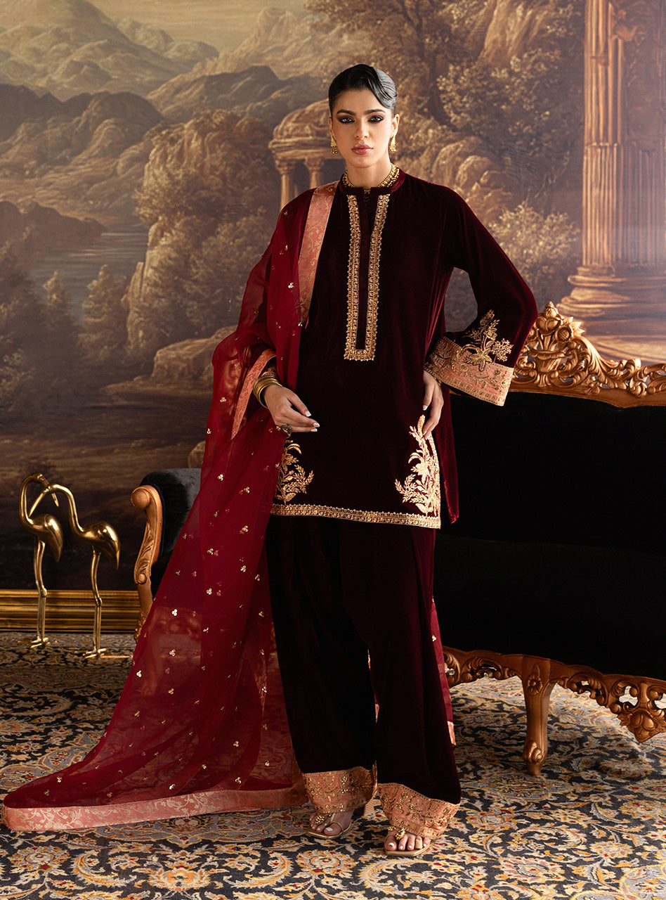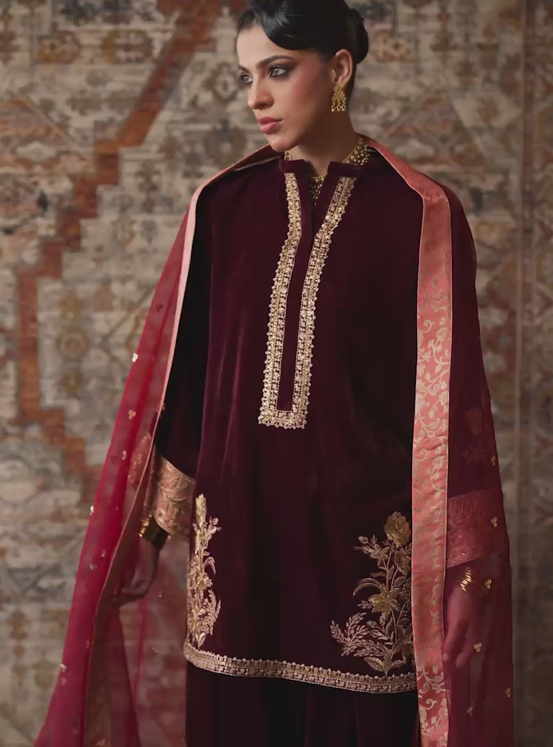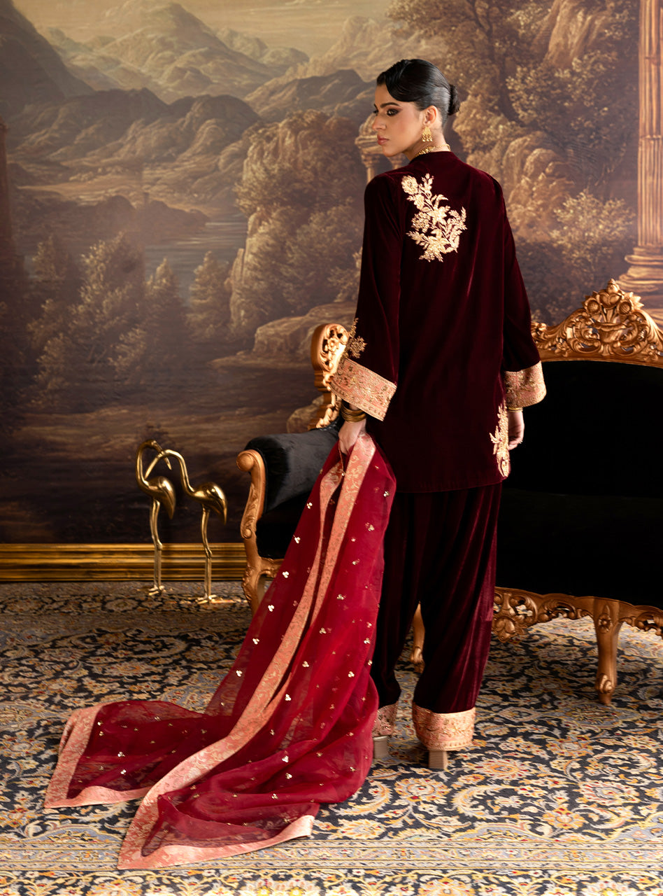 A sophisticated three-piece ensemble showcasing classic tailoring and rich texture. This outfit is crafted from luxurious Maroon velvet, featuring a traditional short-cut kurta with elaborate gold tilla embroidery that forms a detailed border along the neckline, hem, and cuffs. The back is beautifully adorned with a magnificent gold floral motif. It is paired with a matching velvet shalwar, exquisitely finished with coordinating embroidery at the cuffs, completing the regal look. A sheer maroon organza dupatta, scattered with gold sequin work, drapes gracefully.