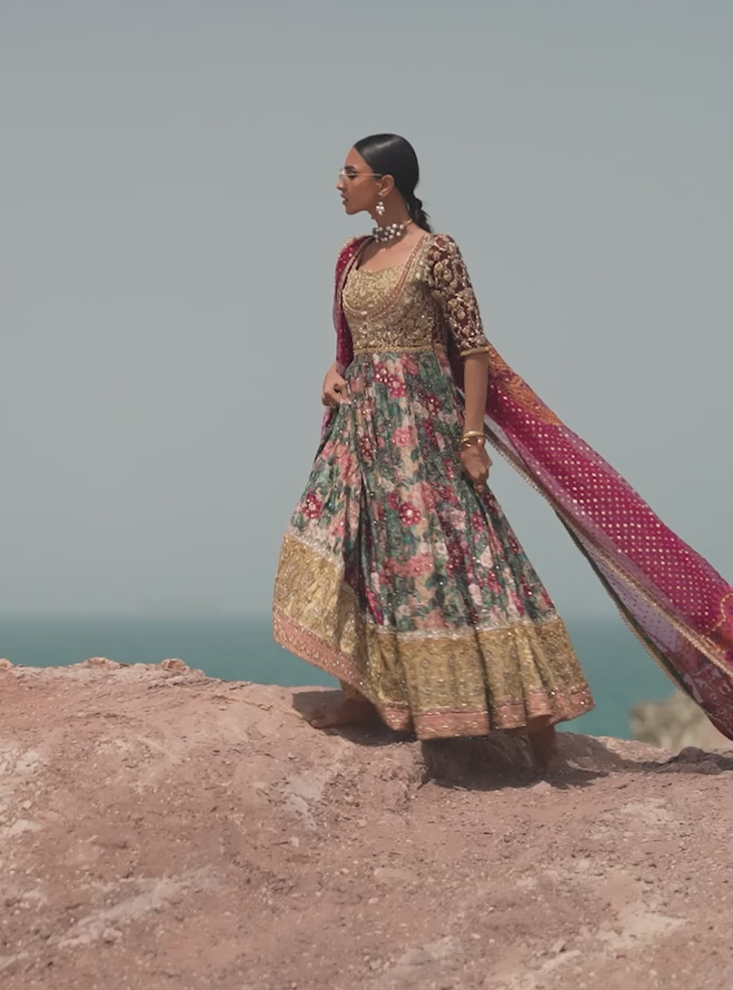 The ensemble features an exquisitely tailored anarkali, where the bodice is encrusted with dense gold metallic threadwork that transitions into a vibrant, multi-tonal floral skirt. A regal crimson dupatta, delicately sprayed with sequins and finished with an intricate lace border, drapes elegantly to complete this timeless silhouette, paired with chooridar pants. This masterpiece captures the essence of a "Night Garden" in full bloom.