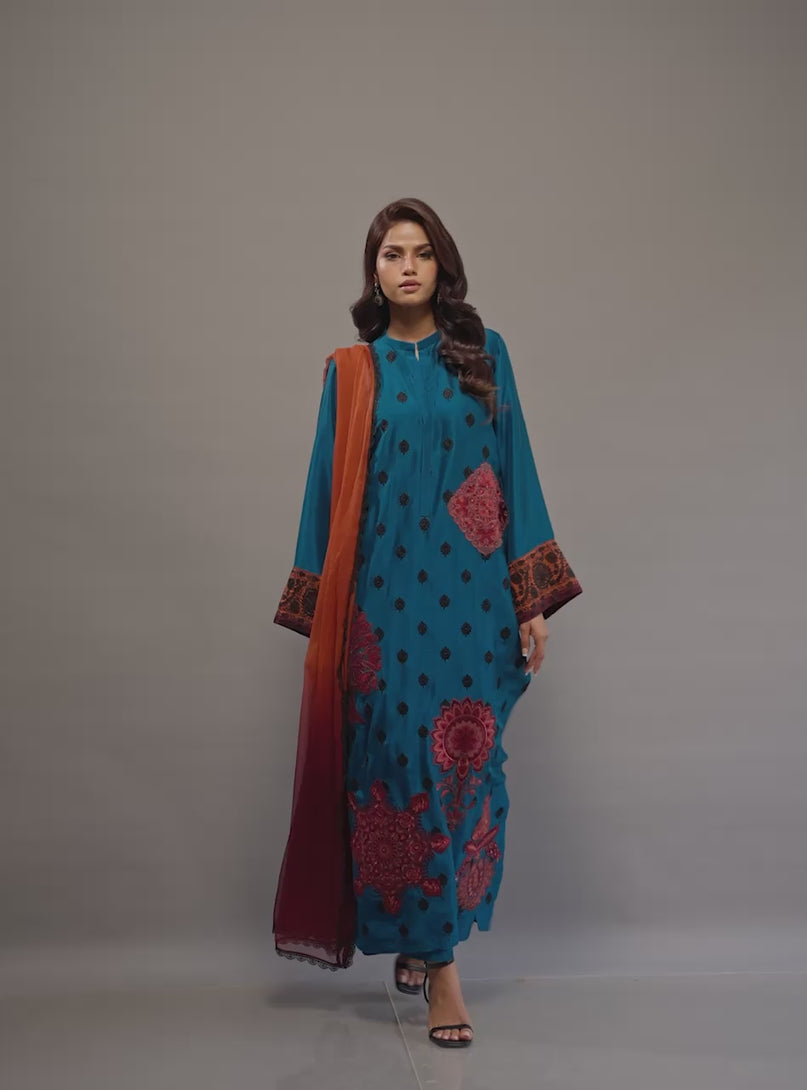 Capture the essence of artisanal beauty in this striking teal ensemble, where traditional Suzani craft meets a vibrant, modern palette. The long shirt is intricately detailed with all-over black motifs and bold, rust-toned medallions that anchor the hem and the wide, statement cuffs. A sophisticated band collar adds a refined structure to the silhouette, while the dual-toned rust dupatta provides a warm, glowing contrast to the cool peacock blue base. This masterpiece of color and craft is the ultimate choice for a standout Eid look.