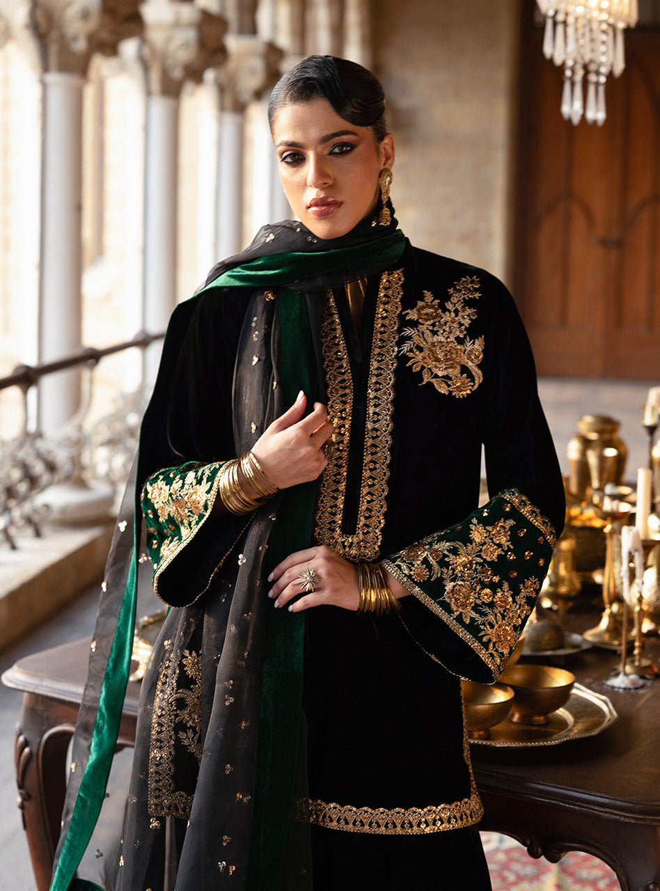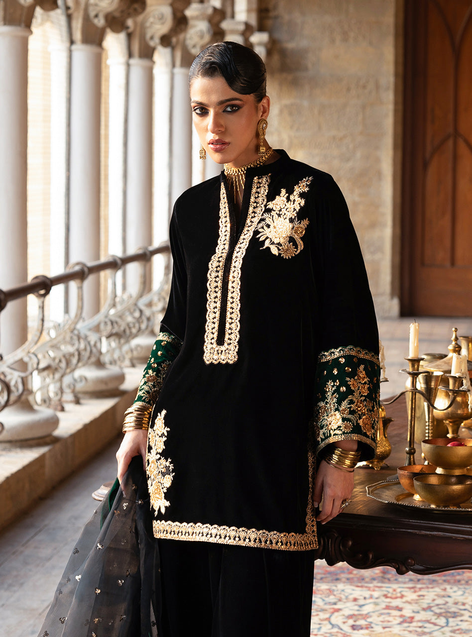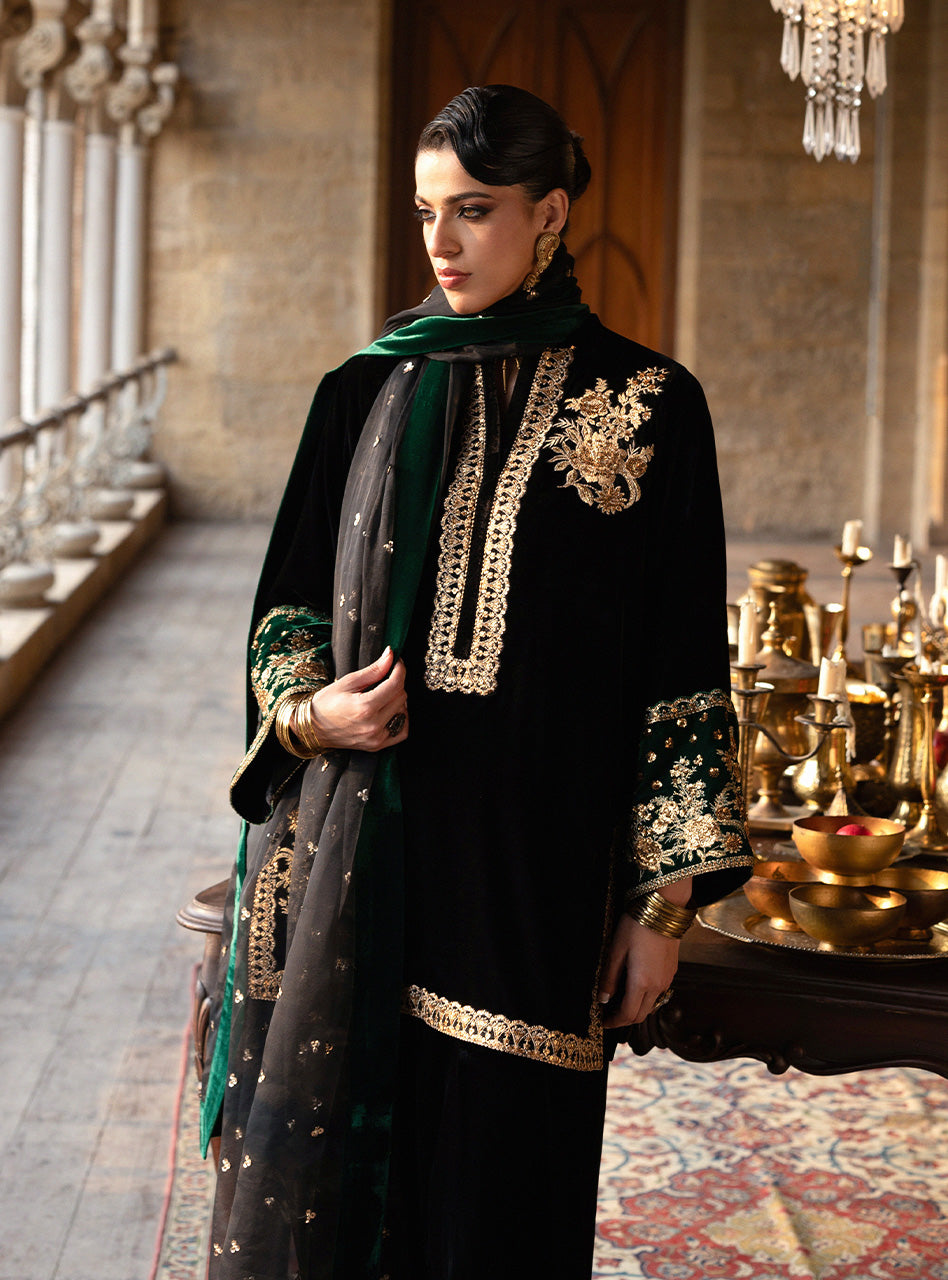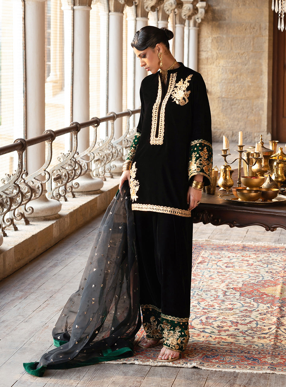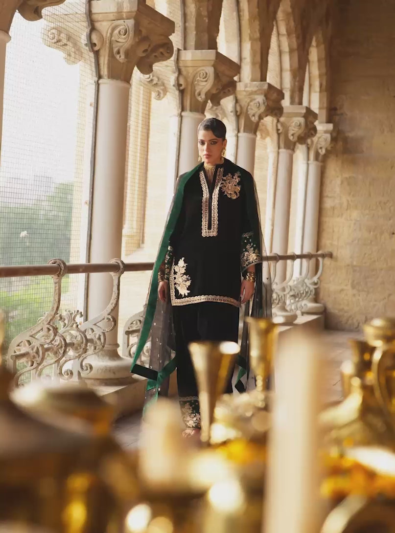Adorn yourself in the timeless elegance of Emel Farshi, a sophisticated ensemble crafted from luxurious Black velvet. This exquisite short kurta is a masterpiece of design, featuring intricate gold embroidery that lavishly embellishes the neckline, front, and cuffs. The rich gold work extends to a grand floral motif on the back, while a striking Emerald Green velvet border, also detailed with complementary gold embroidery, elegantly frames the sleeves and hem. The outfit is completed by velvet farshi and a sheer black organza dupatta with chan.
