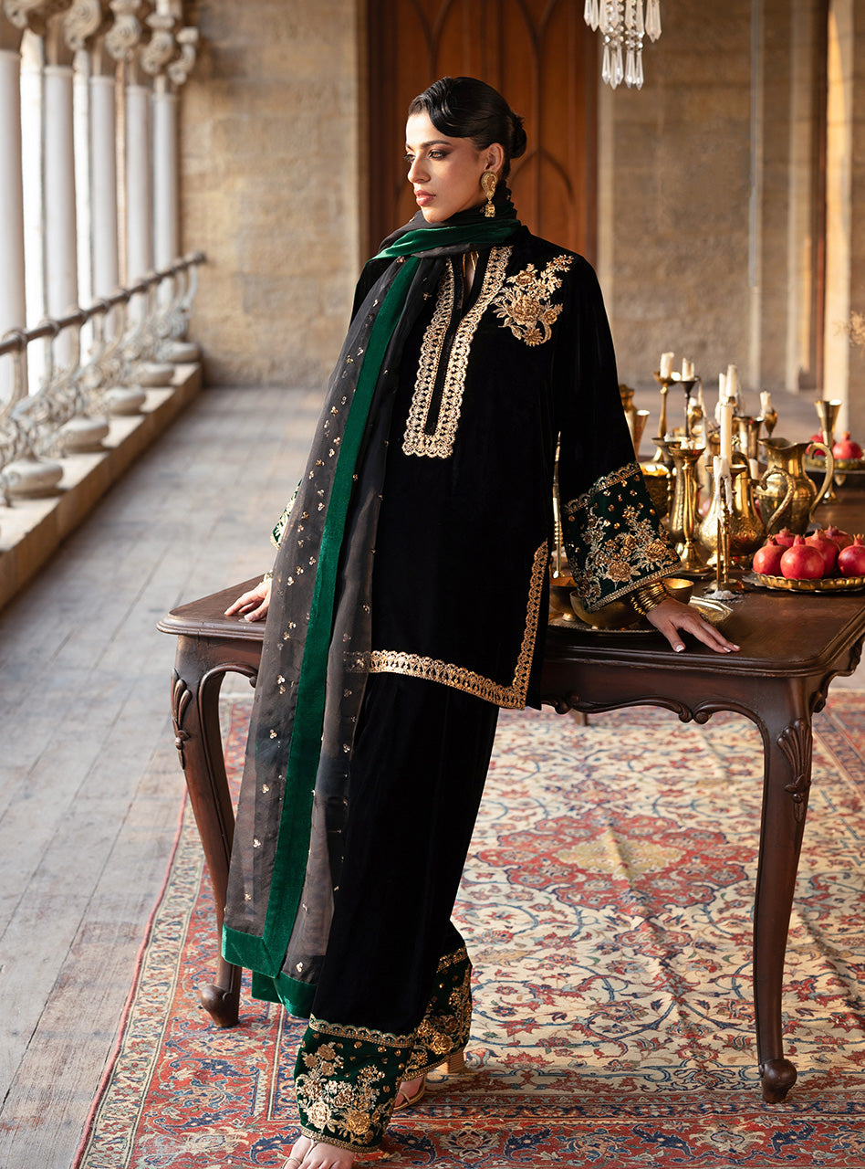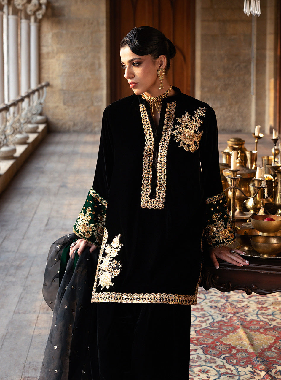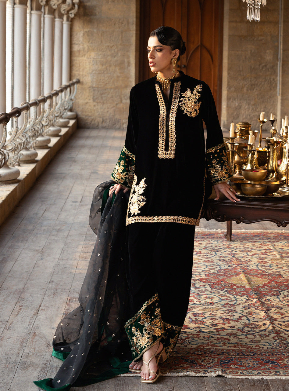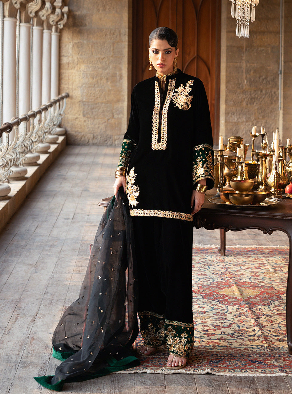 Adorn yourself in the timeless elegance of Emel Farshi, a sophisticated ensemble crafted from luxurious Black velvet. This exquisite short kurta is a masterpiece of design, featuring intricate gold embroidery that lavishly embellishes the neckline, front, and cuffs. The rich gold work extends to a grand floral motif on the back, while a striking Emerald Green velvet border, also detailed with complementary gold embroidery, elegantly frames the sleeves and hem. The outfit is completed by velvet farshi and a sheer black organza dupatta with chan.