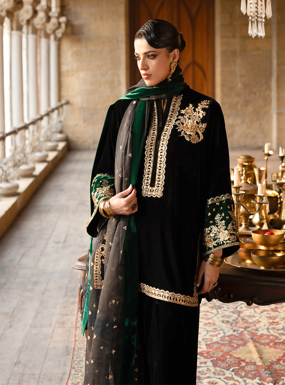 Adorn yourself in the timeless elegance of Emel Farshi, a sophisticated ensemble crafted from luxurious Black velvet. This exquisite short kurta is a masterpiece of design, featuring intricate gold embroidery that lavishly embellishes the neckline, front, and cuffs. The rich gold work extends to a grand floral motif on the back, while a striking Emerald Green velvet border, also detailed with complementary gold embroidery, elegantly frames the sleeves and hem. The outfit is completed by velvet farshi and a sheer black chiffon dupatta with chan.