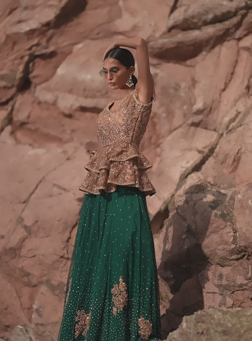 This ensemble features a meticulously hand-embellished peplum bodice in antique gold, radiating a celestial glow through intricate zardozi and shimmering crystals. The silhouette is dramatically elevated by a deep emerald green lehenga, reminiscent of lush foliage under a moonlit sky, adorned with delicate sparkling motifs and traditional craftsmanship. Finished with a voluminous, multi-tiered ruffled dupatta that cascades like ethereal shadows.