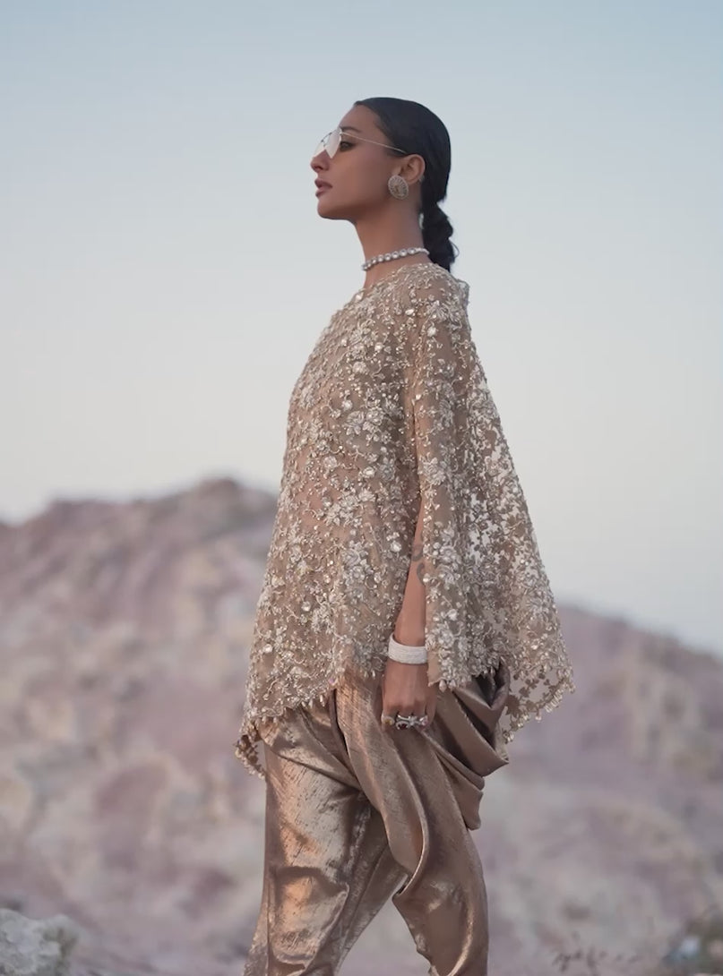The silhouette features a meticulously crafted one-shoulder cape in antique bronze lace, lavishly adorned with hand-worked floral filigree and shimmering crystalline droplets that cascade elegantly over the arm. This is paired with voluminous, tapered trousers in a liquid-metallic fabric that catches the light with a soft, burnished glow, creating a striking contrast between the delicate transparency of the lace and the bold structure of the base. Perfect for the contemporary muse, this look is a sophisticated celebration of movement, light, and unrivaled artisanal luxury.