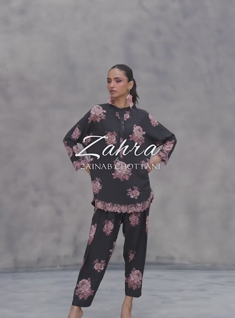 Okay, stop scrolling because you just found the fit. This black viscose set is serving major Moody Romance vibes. Covered in dreamy, dusty-pink florals, it’s the perfect blend of edgy and sweet. The relaxed-fit kurta and slouchy shalwar are ridiculously cozy, but that super cute scalloped border on the hem and cuffs? That’s the Elevated Flex that takes it to the next level. Pair it with heels for a dinner date or your favorite kicks for a chill day out either way, you're giving!