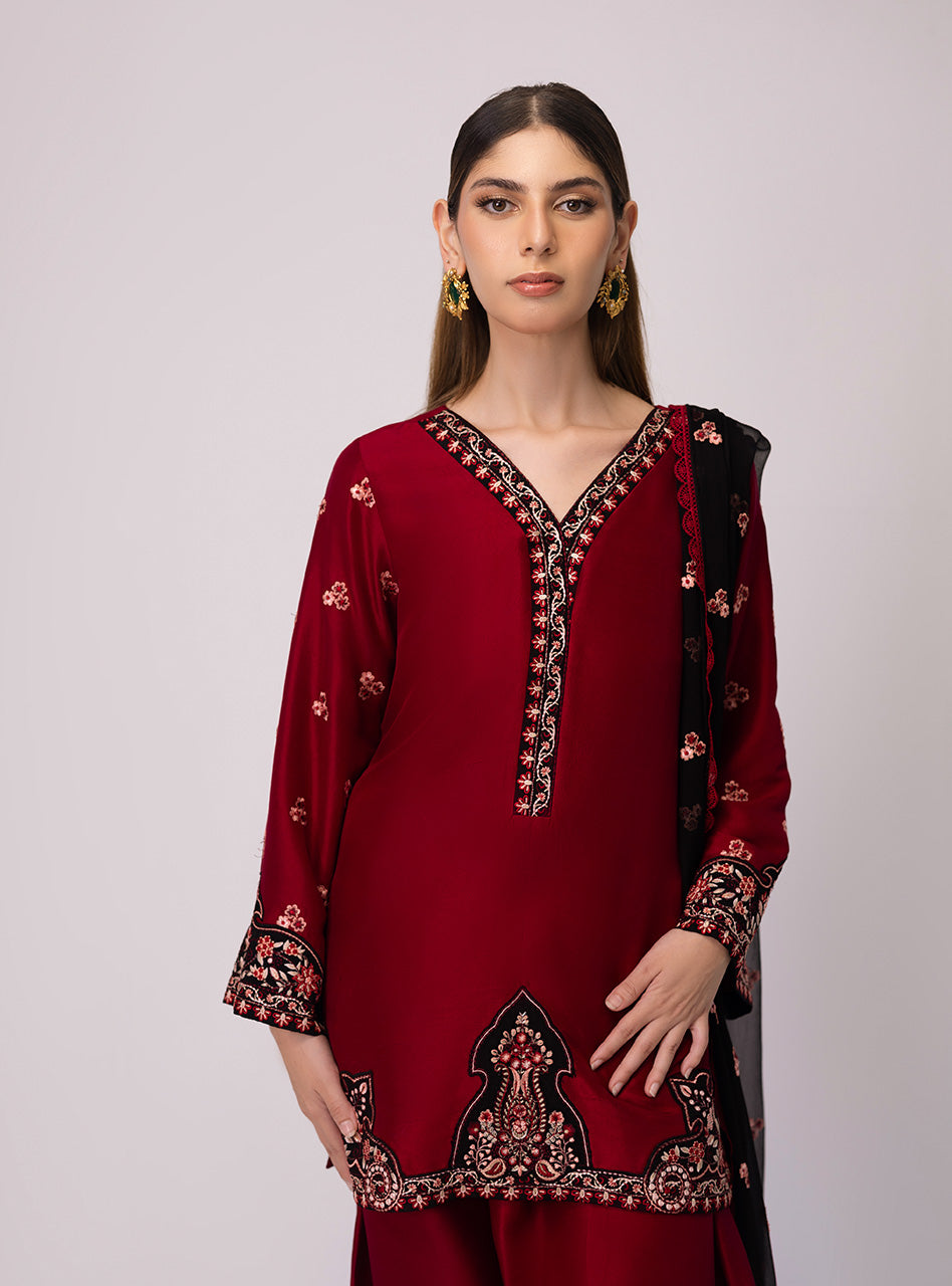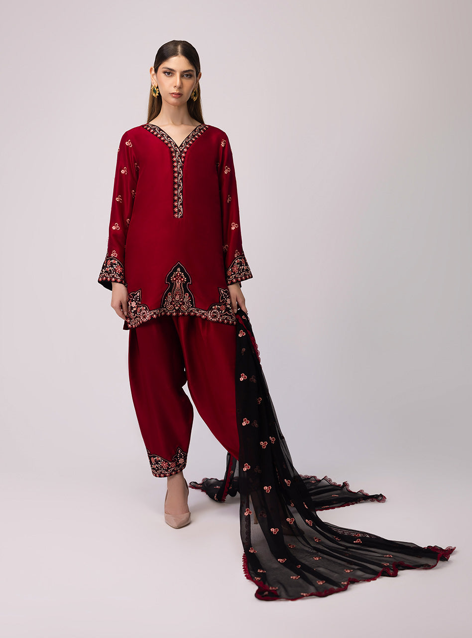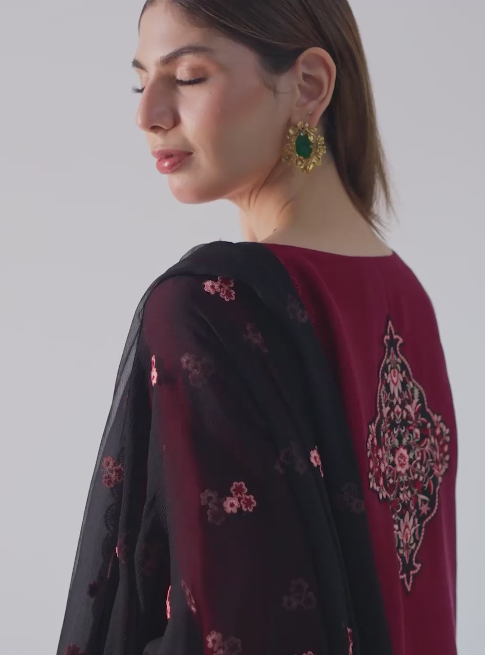 Ilaya, This beautiful three-piece outfit features a deep maroon raw silk short shirt with embroidery on the front, including a detailed V-neckline, embroidered sleeves, and a prominent hem design. It is paired with comfortable shalwar that have matching embroidered cuffs. The ensemble is completed with a black chiffon dupatta adorned with scattered embroidery, creating a sophisticated, stylish, and elegant look.