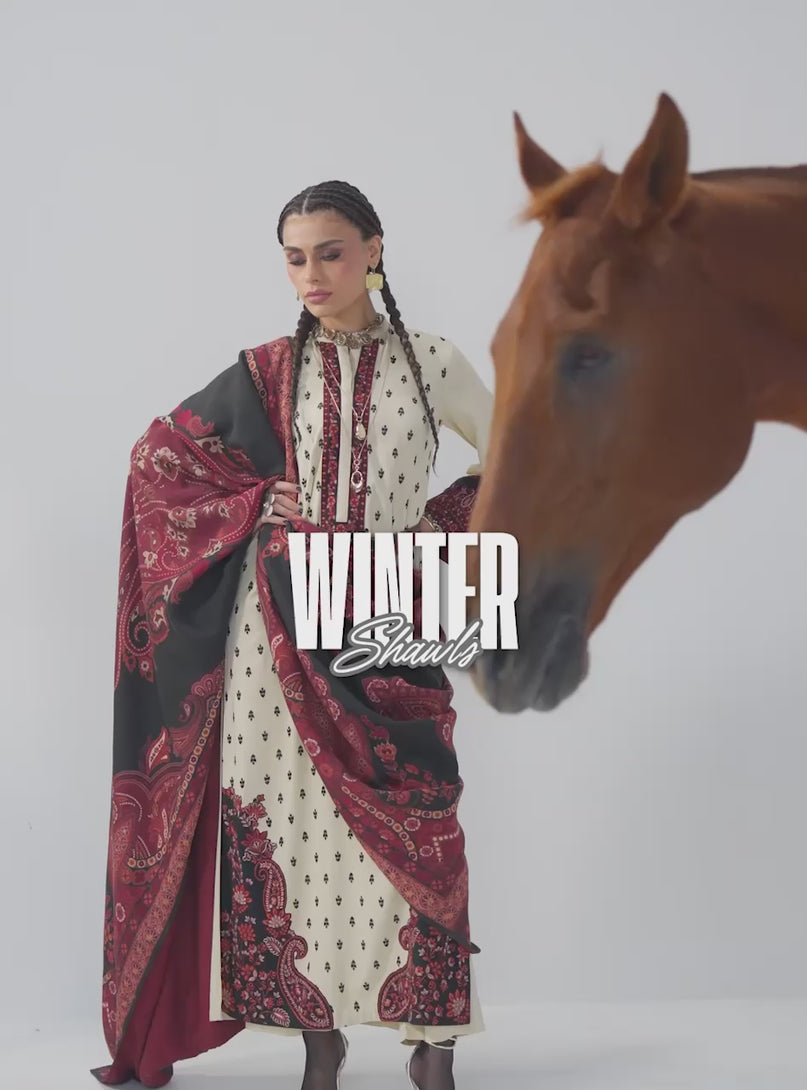 Imani the epitome of refined winter luxury, grounding the collection in a striking, monochromatic classic palette. The flowing cream Marina Twill suit, adorned with delicate black abstract motifs, provides the perfect canvas for the dramatic Lenzing Ecovero shawl. This exquisite shawl is defined by its deep black base, illuminated by intricate, fiery paisley and baroque patterns in rich maroon and crimson. The design captures a regal grace, suggesting artifacts discovered on a grand journey.
