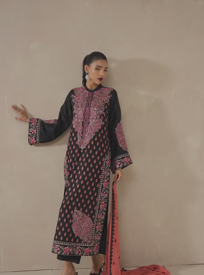 Command attention with Imperial Rose, the crown jewel of our Eid Pret series. This article features an intensive display of craftsmanship, with every inch of the neckline and border telling a story of floral elegance on raw Silk. The structured embroidery provides a slimming silhouette while the rich color palette ensures you glow under the festive lights. Paired with coordinating Silk pants and a delicately detailed dupatta, it is the perfect choice for a sophisticated Eid night.