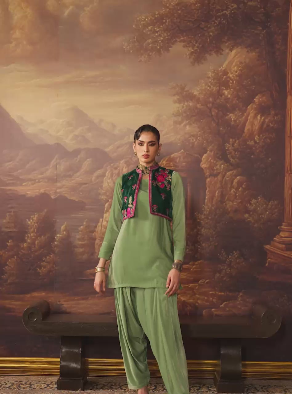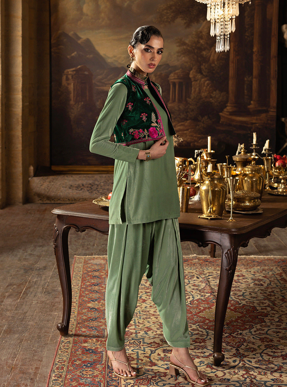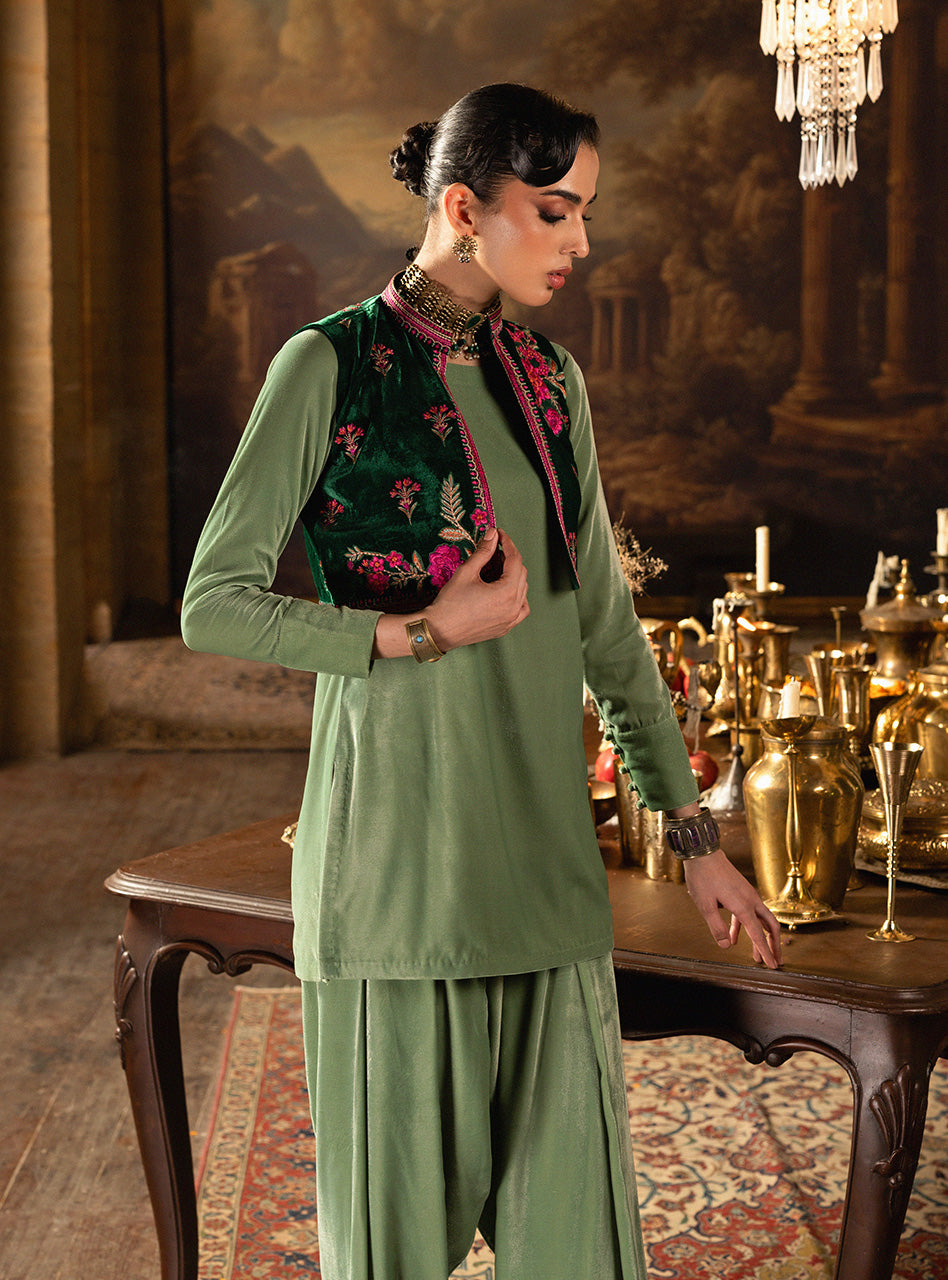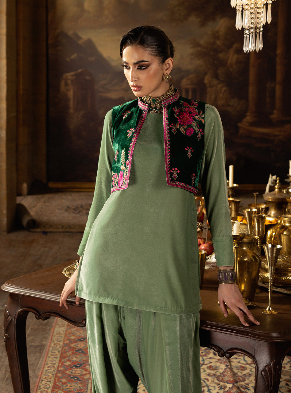Embrace the modern festive vibe of Jade Bolero, a luxurious ensemble that makes you feel instantly chic and vibrant. The foundation is a buttery soft Sage Green Velvet shalwar kameez, offering a relaxed yet flattering drape. The standout piece is the beautifully structured Emerald Velvet koti (jacket), which cinches your look and adds an essential layer of dramatic texture. This cropped koti is exquisitely adorned with bold fuchsia embroidery in a delightful floral pattern, giving the entire outfit a surprising, playful energy.