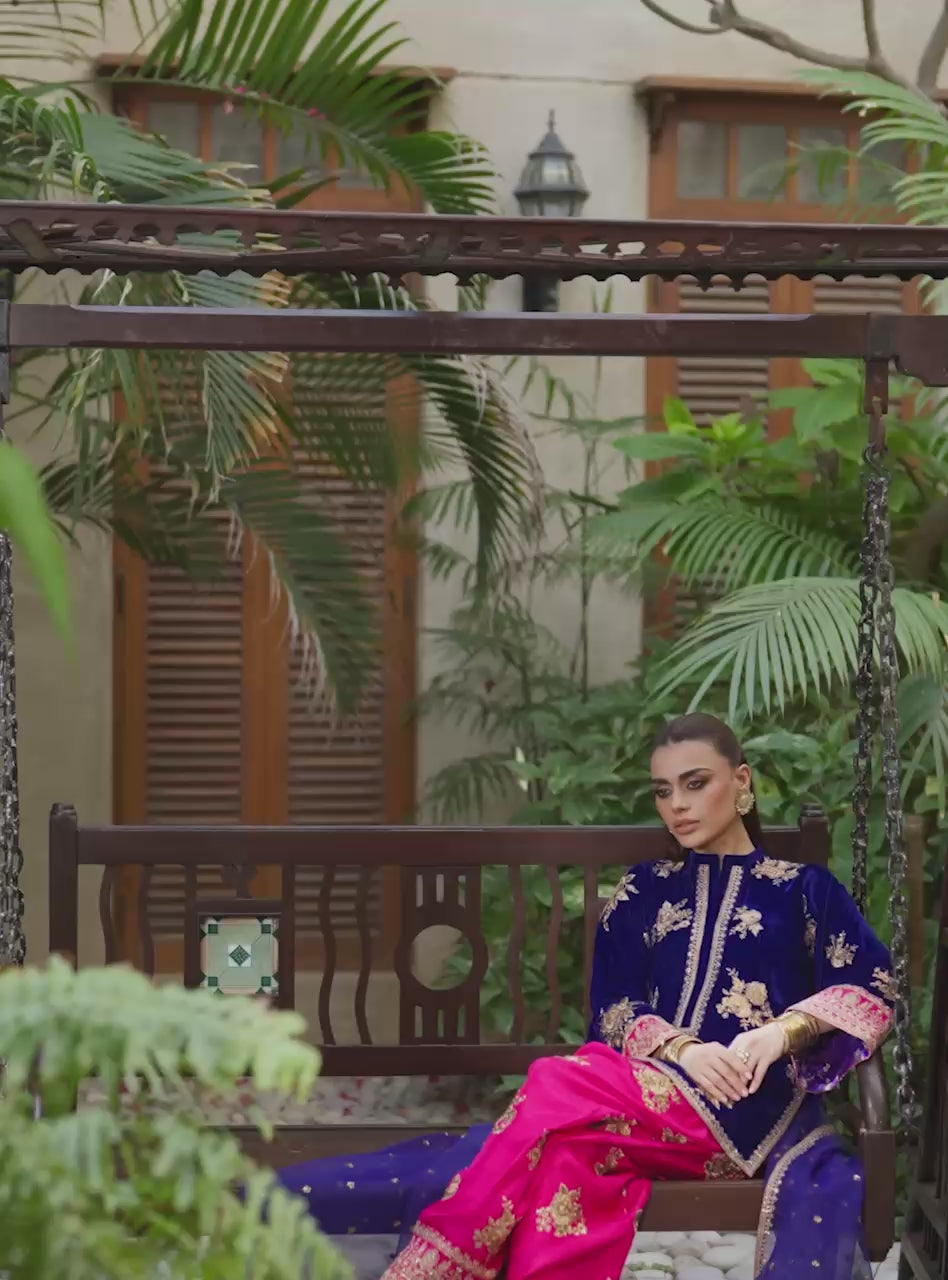 A luxurious three-piece statement-making look with a short Navy Blue Velvet shirt featuring exquisite gold Dabka and Zari embroidery. It provides a daring contrast to the bold Hot Pink Raw Silk Shalwar with embroidered cuffs. The outfit is balanced by a sheer Deep Purple Organza Dupatta, tied together with a thin hot pink embroidered border.