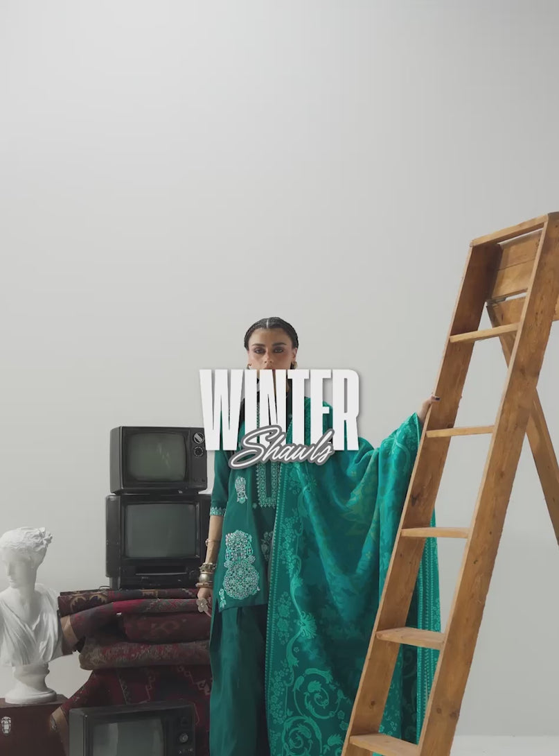 Kyana is a statement of unparalleled depth and luxury, captured entirely in the most mesmerizing jewel tones. The flowing Marina Twill ensemble is drenched in a profound emerald green, providing the ideal backdrop for intricate, tonal embroidery in teal and lighter jade hues. The complex motifs cascade across the suit and onto the matching Lenzing Ecovero shawl, creating a seamless, ethereal silhouette that trails elegantly. This monochromatic masterpiece emphasizes artisanal craftsmanship and regal grace.
