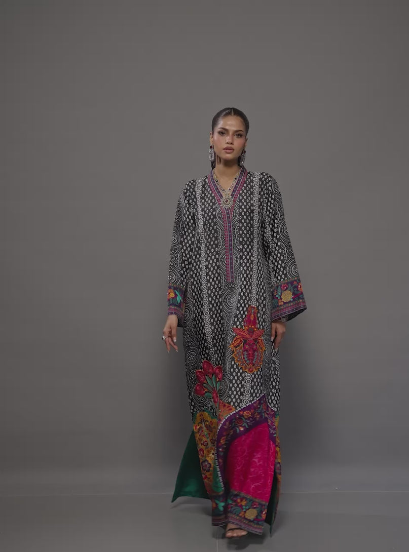 Command the room in this majestic floor-length printed kaftan, where classic monochrome meets a burst of festive color. The garment features an intricate, all-over white geometric dot print on a deep black base, creating a rhythmic and slimming visual effect. The relaxed, flowing silhouette and wide sleeves offer a regal drape, ensuring both comfort and a high-fashion edge. Perfect for evening celebrations, this piece is a masterclass in balancing traditional patterns with a bold, contemporary aesthetic