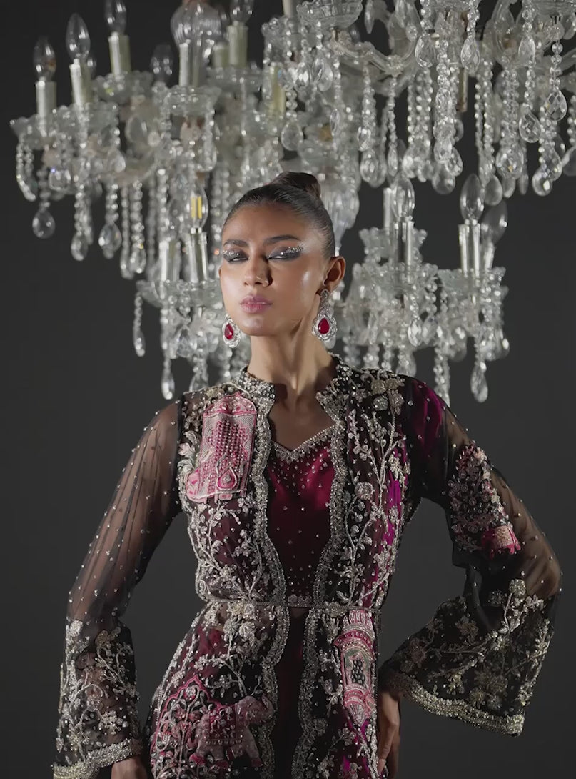 Magenta Étoile is a bold expression of evening glamour, crafted for the woman who commands attention with effortless poise. The ensemble features a richly embroidered jacket adorned with intricate gold handwork and delicate motifs, layered over a sheer black base that creates depth and contrast. Paired with a fluid magenta draped skirt, cascading in soft ruffles and a dramatic trail, the silhouette moves with graceful intensity. The interplay of luminous embellishment and vibrant hue captures the essence of Lumière, evoking a star-like radiance that shines long after nightfall.