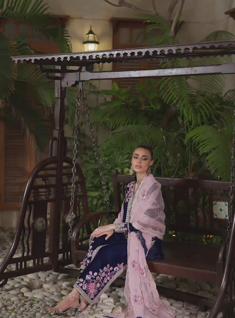 A luxury unstitched three-piece ensemble crafted from sumptuously soft midnight blue velvet. The rich, deep hue of the velvet serves as a perfect canvas for the intricate floral embroidery that gracefully adorns the front open jacket style shirt. Delicate patterns in shades of blush pink, muted gold, and hints of silver embellish the neckline, sleeves, and extended borders, reflecting meticulous craftsmanship. The raw silk trousers are tastefully detailed with matching embroidered motifs at the cuffs, creating a cohesive and polished look. Completing this regal attire is a mesmerizing powder pink organza dupatta, beautifully edged with a thin contrast border.