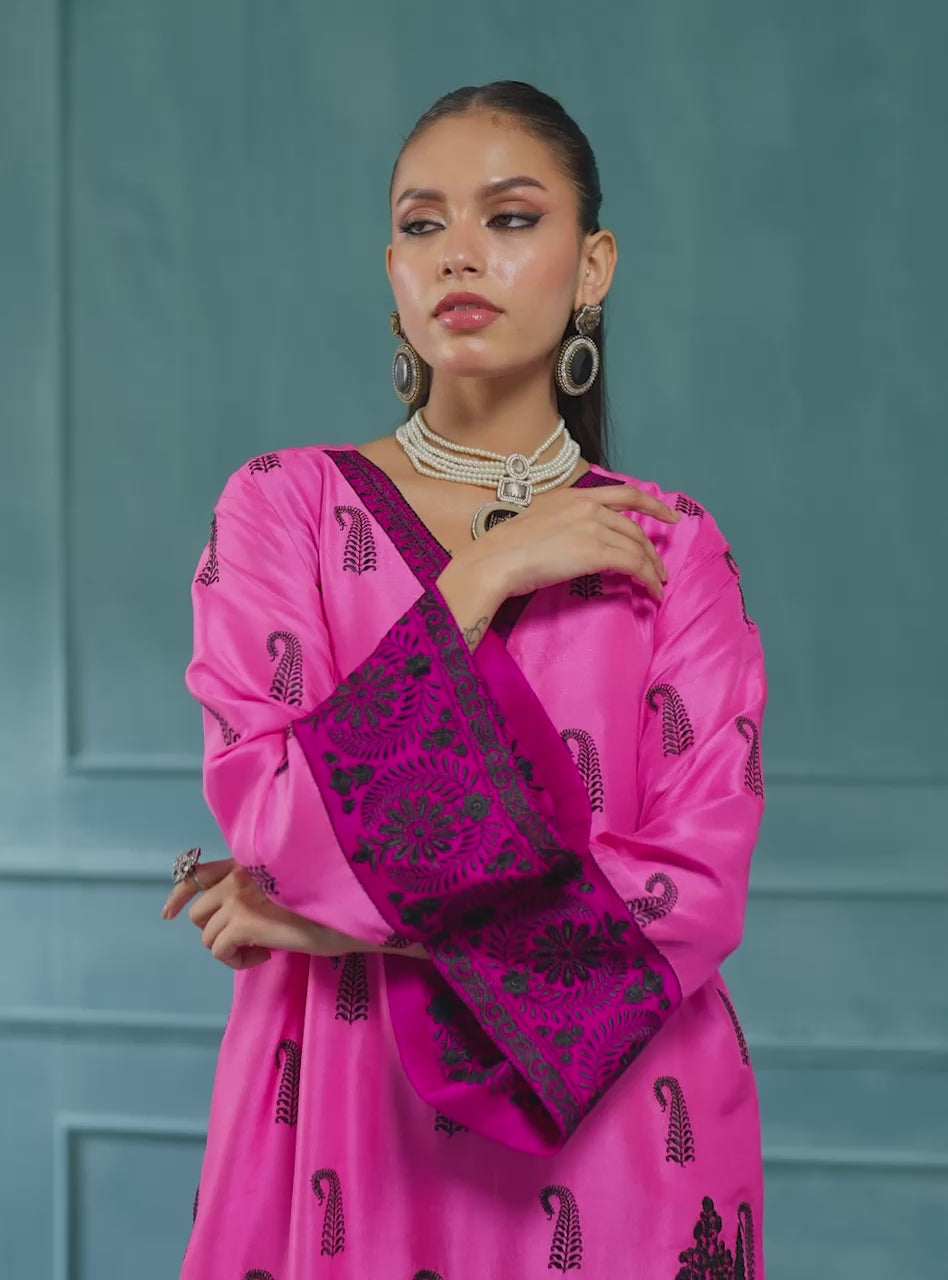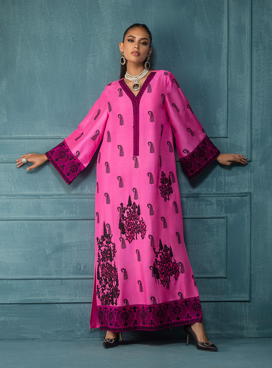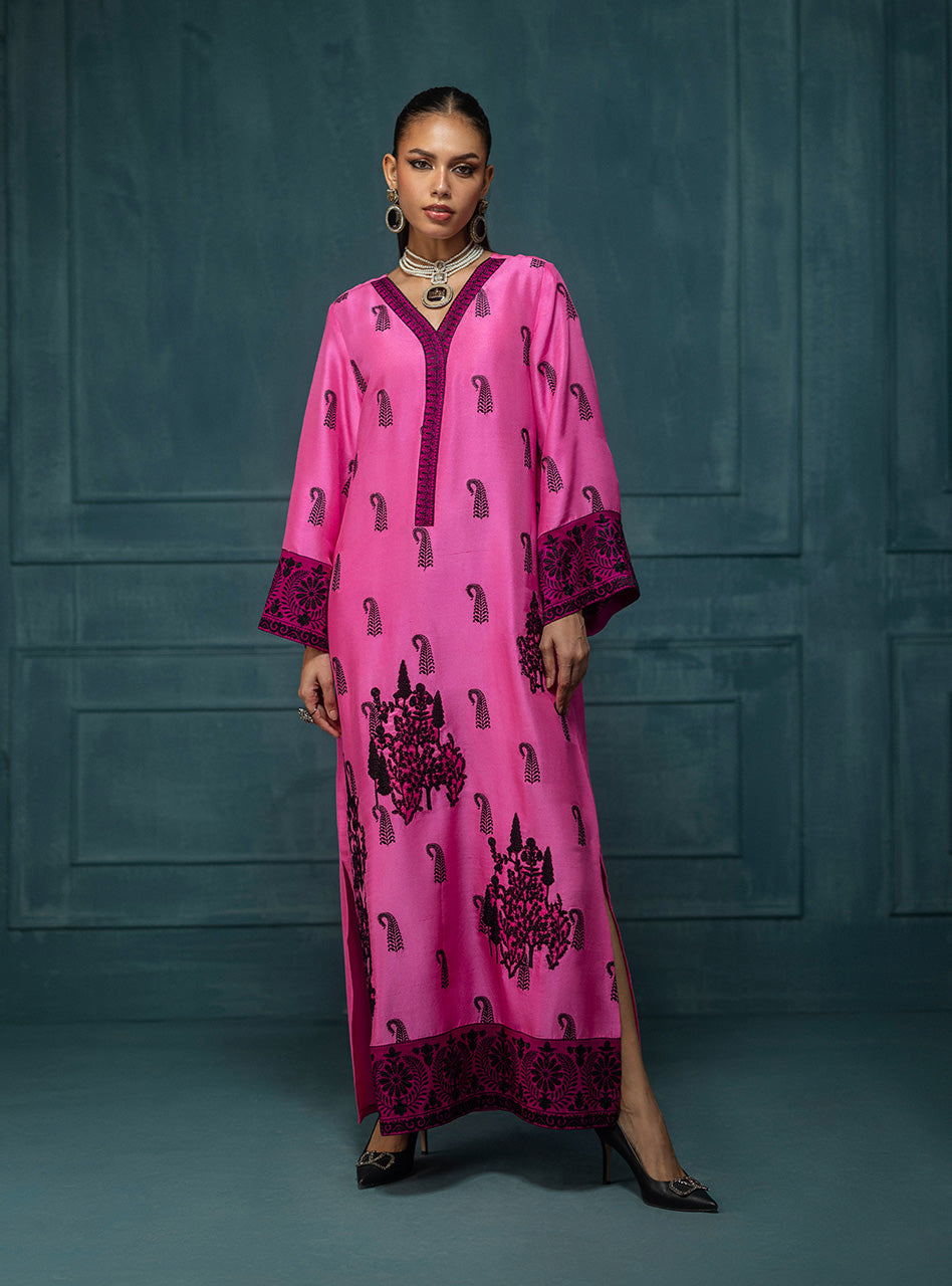 Mehrin, a captivating raw silk kaftan in a mesmerizing shade of pink. This luxurious kaftan features a comfortable, flowing silhouette, making it a perfect blend of style and ease. The piece is richly adorned with intricate black embroidery, showcasing delicate paisley motifs scattered across the body and elegant patterns on the wide sleeves. The kaftan is further enhanced by a beautifully embroidered V-neckline and a striking, centralized motif at the back, adding an element of surprise and intricate artistry.