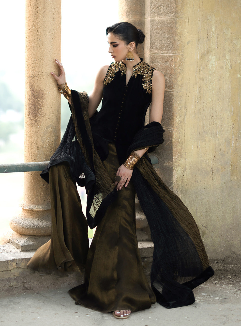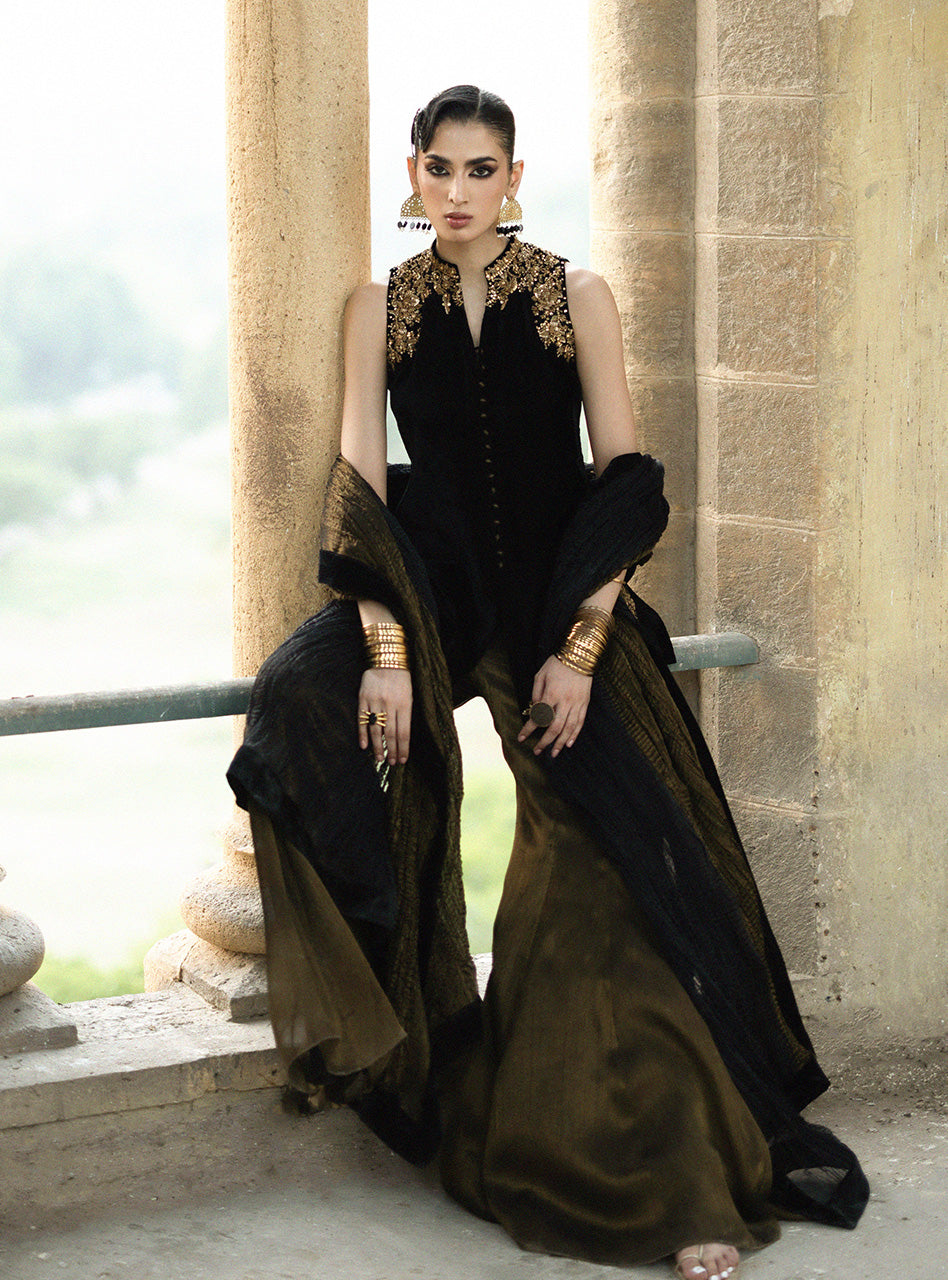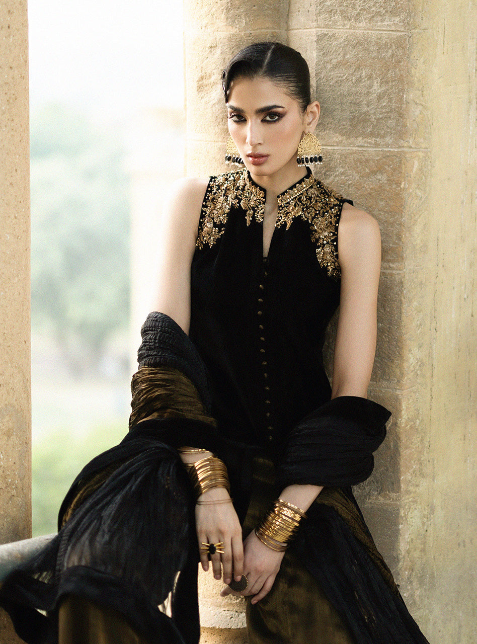 Step into a world of undeniable luxury and exquisite artistry with Mihr gold. This is an outfit that makes you feel utterly magnificent, crafted from the plushest Jet Black Velvet that drapes flawlessly and feels incredibly rich against your skin. The true magic lies in the breathtaking, intricate gold handwork, meticulously placed around the neckline, shoulders, and hem, sparkling with a refined brilliance that speaks of heritage and skill. Paired with elegantly flared pants and a coordinating crushed dupatta with a velvet border.