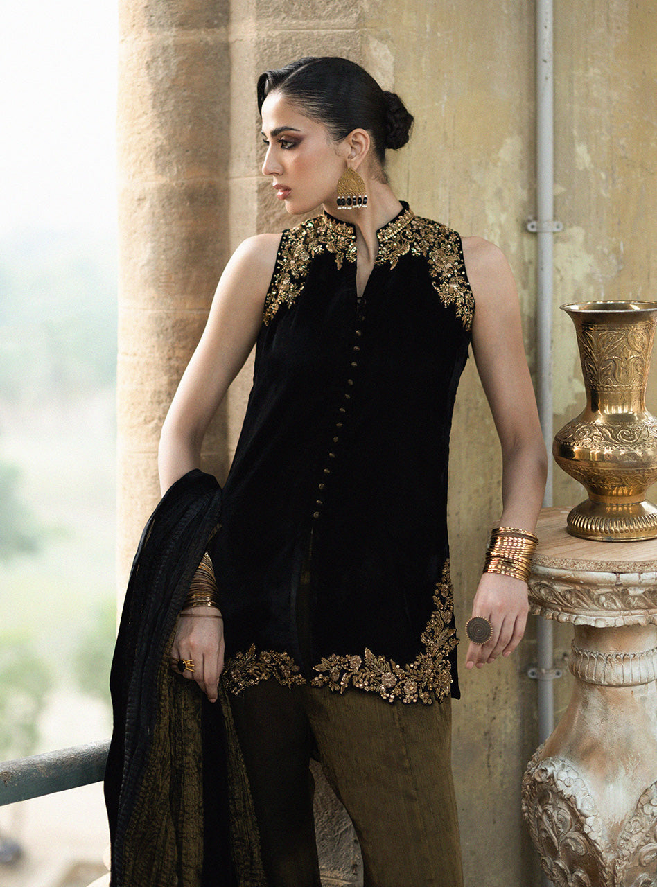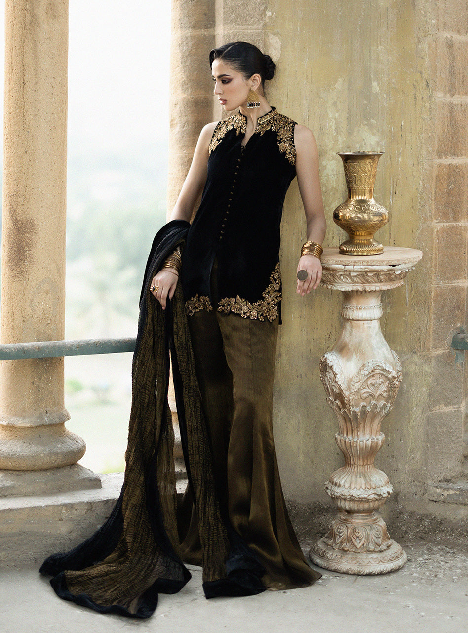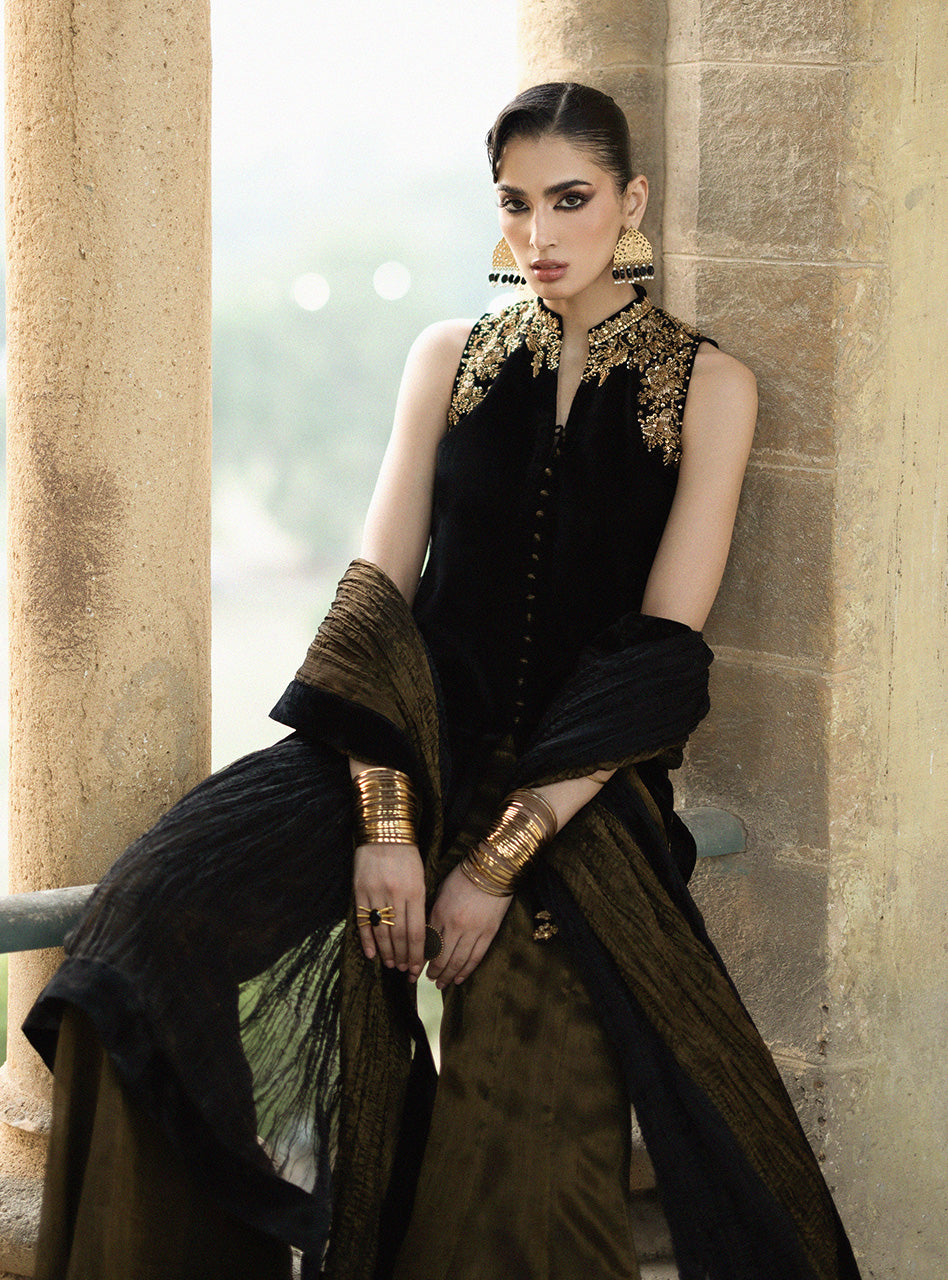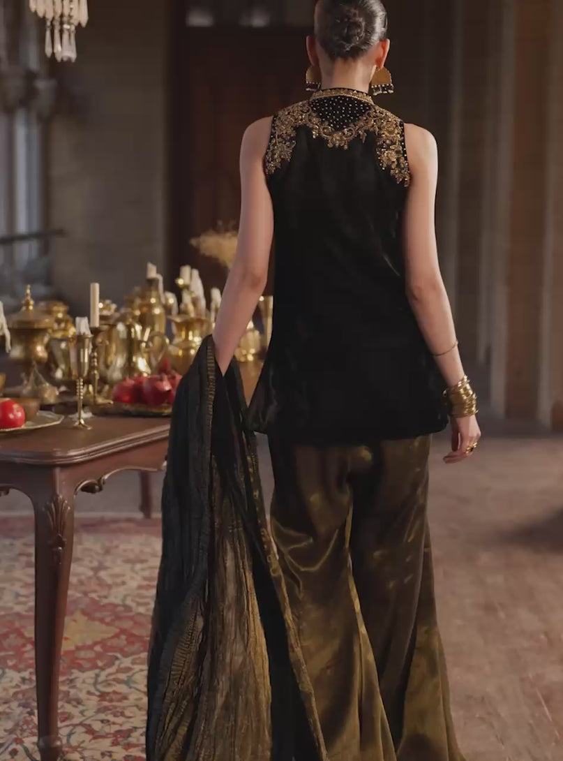 Step into a world of undeniable luxury and exquisite artistry with Mihr gold. This is an outfit that makes you feel utterly magnificent, crafted from the plushest Jet Black Velvet that drapes flawlessly and feels incredibly rich against your skin. The true magic lies in the breathtaking, intricate gold handwork, meticulously placed around the neckline, shoulders, and hem, sparkling with a refined brilliance that speaks of heritage and skill. Paired with elegantly flared pants and a coordinating crushed dupatta with a velvet border.