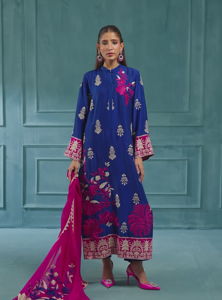 Mishyl, a stunning three-piece ensemble in a beautiful royal blue raw silk. The classic silhouette is brought to life by exquisite embroidery and ink motifs creating a magnificent visual contrast. The shirt is richly detailed with intricate floral bunches that cascade gracefully down the front with a nice bold border. The look is completed by a magnificent pink dupatta, which features its own beautiful floral embroidery and adds a layer of depth and sophistication. The show stopping detail is the delicate floral spray that adorns the back.