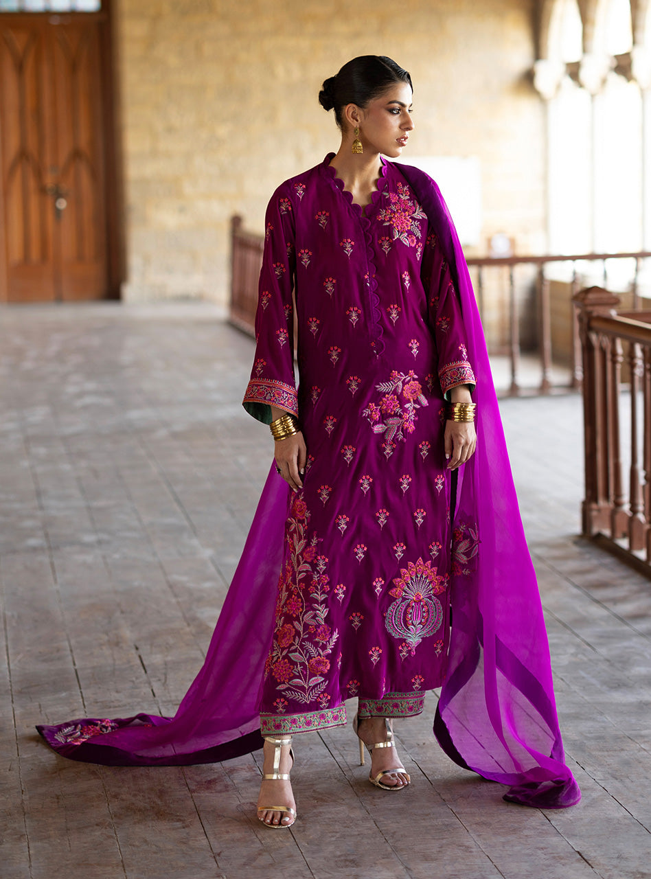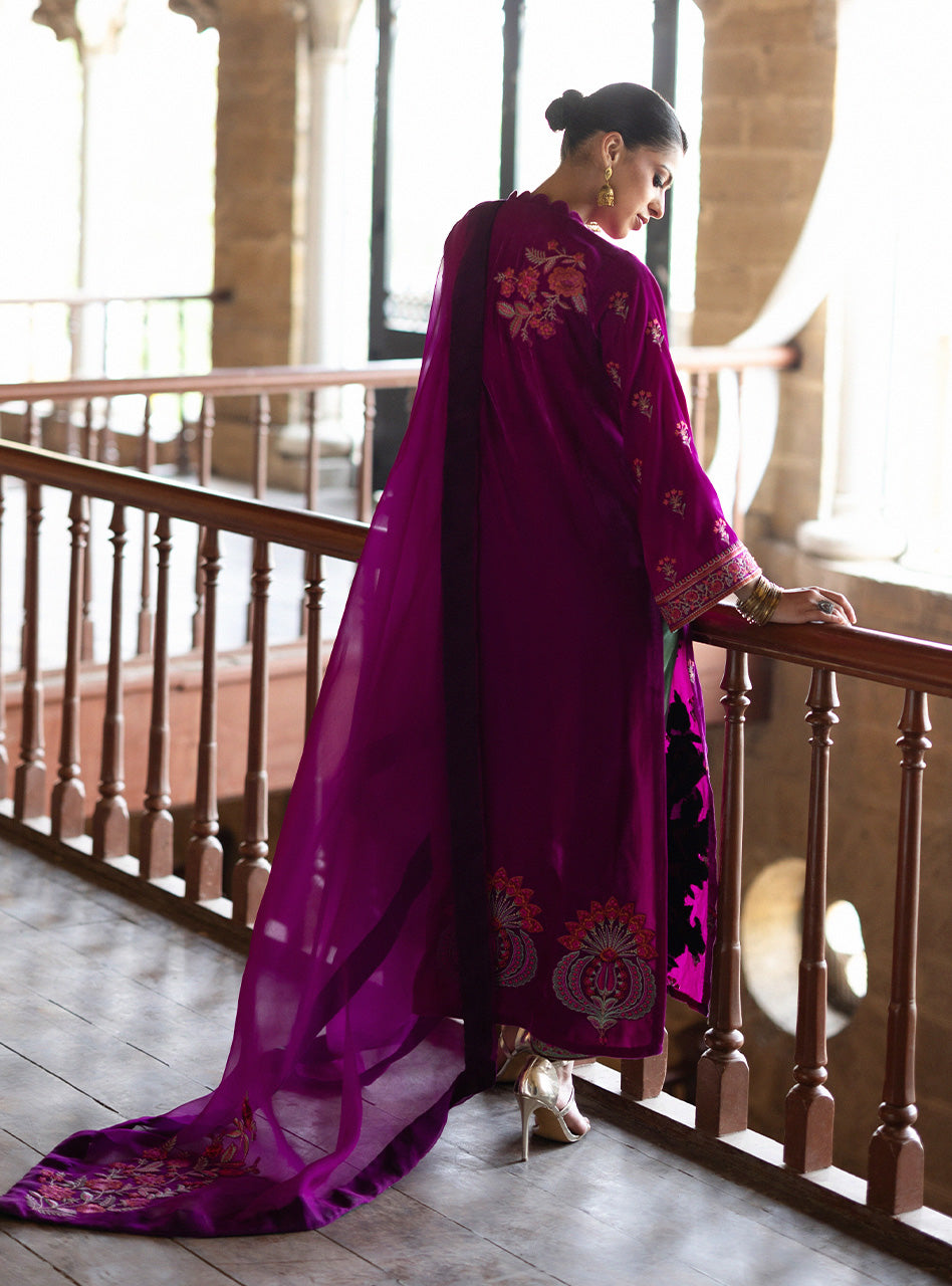 Embrace powerful femininity in Mulberry long shirt. This luxurious prêt ensemble is crafted from sumptuous magenta velvet, offering a magnificent drape and feel. The straight-cut longline shirt is exquisitely detailed with sprawling floral thread-work embroidery in delicate pinks and reds, covering the front panel and extending elegantly onto the sleeves and back.