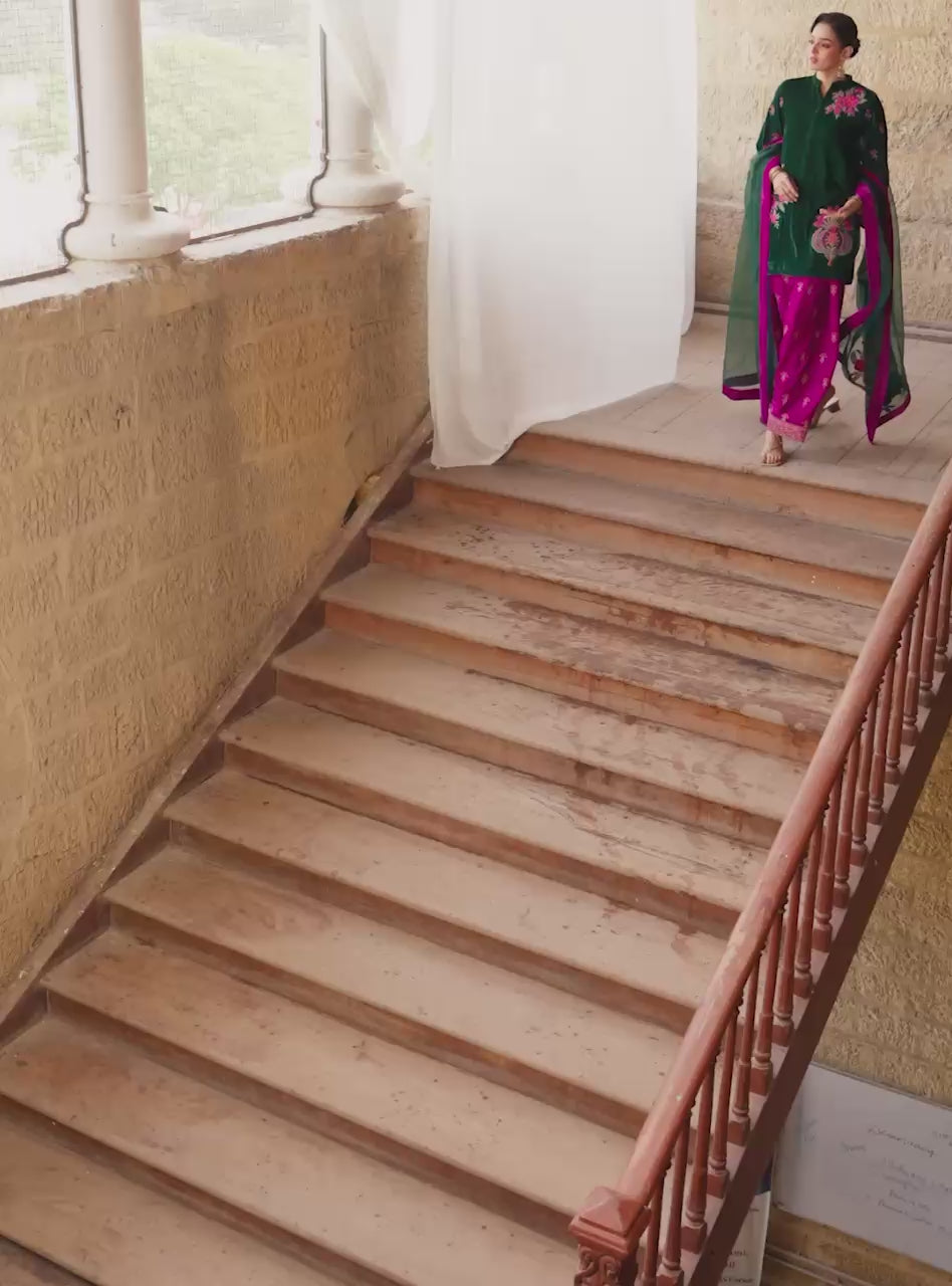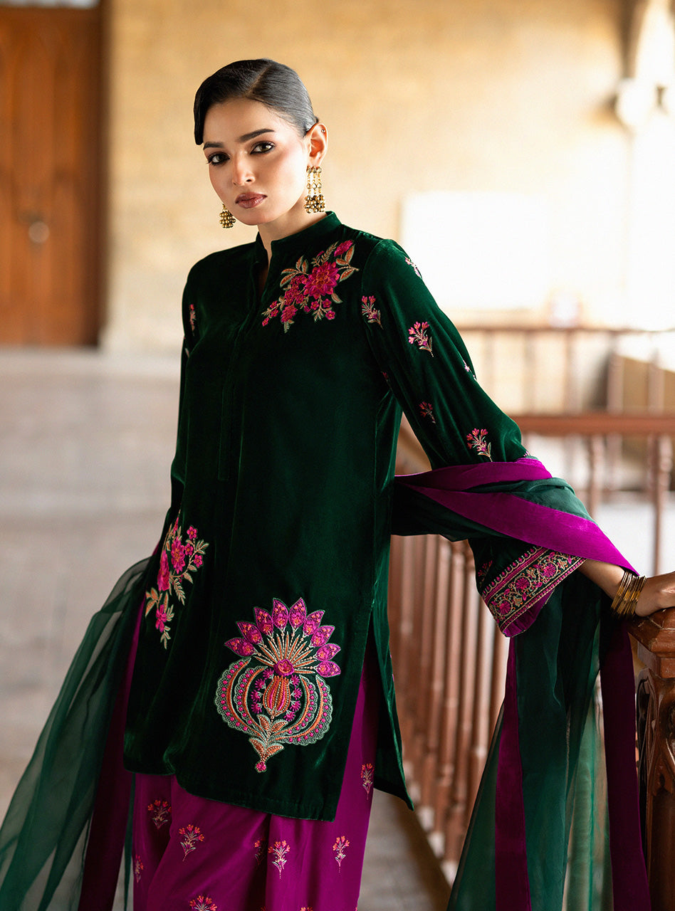 The luxurious Emerald Green velvet kurta features a refined high-neck and is richly adorned with intricate floral thread-work embroidery across the front, sleeves, and a prominent motif on the back. This stunning look is boldly paired with a vibrant magenta velvet shalwar, which is beautifully embellished along its cuffs, and finished with a sophisticated emerald green organza dupatta with embroidery.