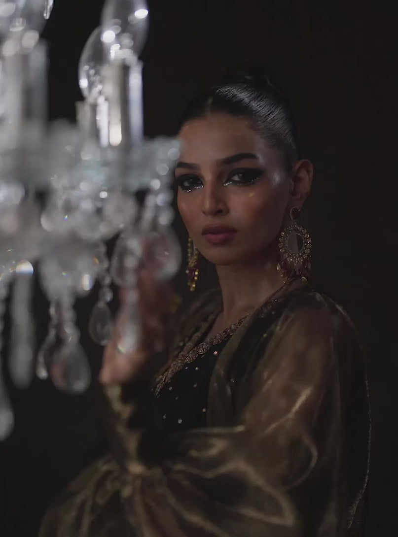 Noir Éclat is a striking black formal ensemble illuminated with intricate gold handwork and delicate scattered embellishments, creating a celestial effect across its sleek silhouette. Paired with a shimmering metallic organza jacket featuring voluminous, airy sleeves, the outfit blends structure with ethereal grace. Rich baroque- inspired embroidery in antique gold and hints of deep rouge accentuates the hem and side slit, adding depth, opulence, and movement.
