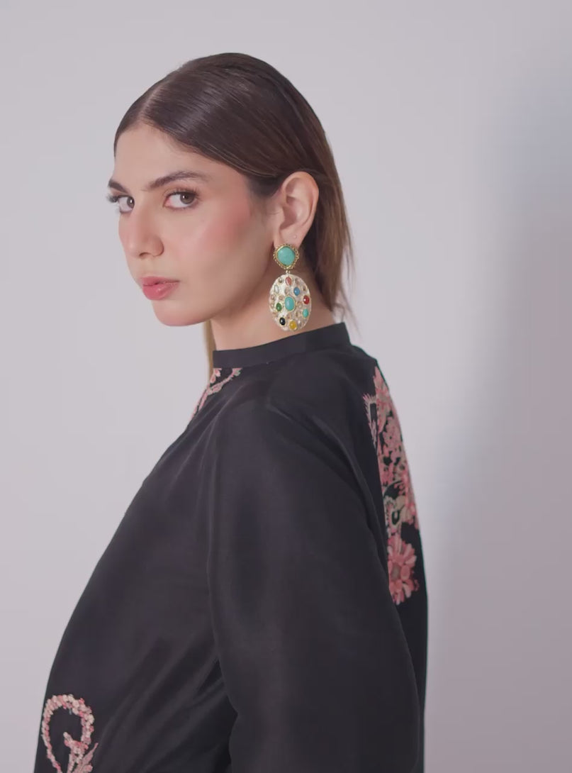 Nurah, this striking three-piece outfit features a black raw silk short shirt with floral embroidery....