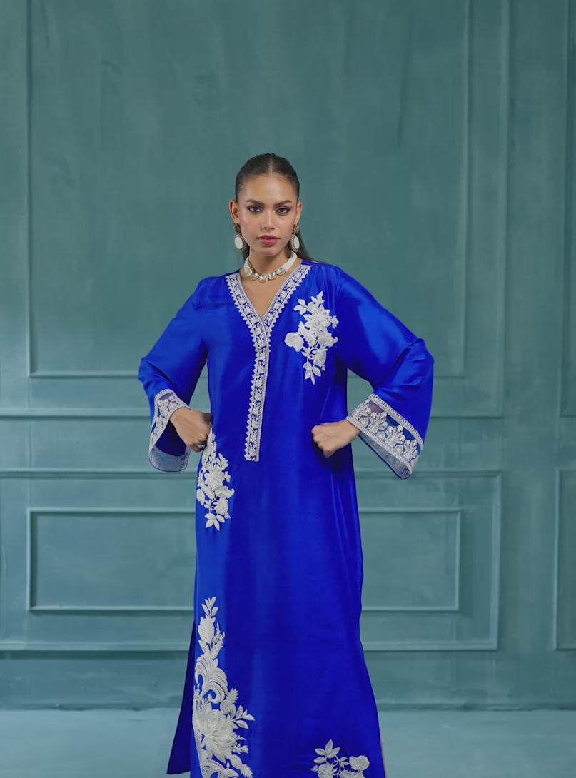 Ranya, a vibrant cobalt blue kaftan crafted from luxurious raw silk. The fluid silhouette is brought to life by intricate white embroidery that creates a beautiful contrast. The kaftan features a detailed V-neckline and delicate floral bunches that cascade down the front and back. The sleeves are also adorned with a beautiful embroidered border, adding to the refined aesthetic.