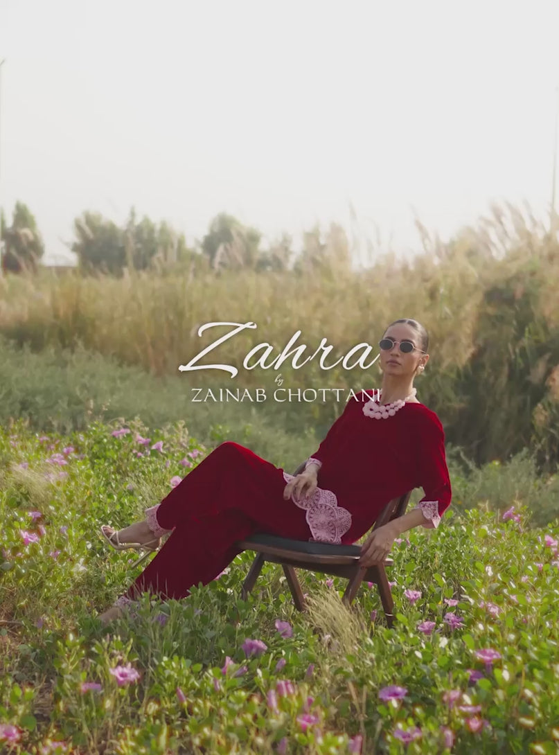 You just found your new favorite winter fit! The Valentine Slay co-ord is pure core energy, wrapped in the dreamiest, softest maroon velvet. The short kurta silhouette is effortlessly chic, but it's the details that make the difference: the scalloped, intricate pink lace trim on the hem, sleeves, and shalwar cuffs. It’s the perfect touch of sweet femininity to balance the rich color.