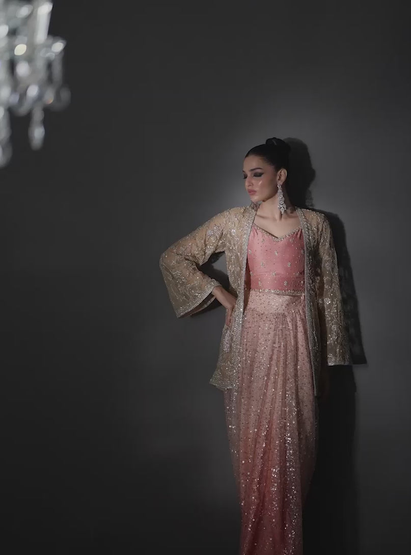 The Rosé Lumière is an expression of feminine radiance and modern artistry, featuring a meticulously draped, pre-stitched sari or lehenga in a soft blush pink hue, entirely blanketed in shimmering rose-gold sequins that catch the light with liquid grace. The ensemble is anchored by a matching, delicate scoop-neck crop top and elevated by a short, structured bell-sleeve jacket crafted from sheer net. This jacket is the focal point, adorned with intricate, three-dimensional floral appliqué and detailed gold zari work that cascades over the shoulders and dramatically flared cuffs, merging contemporary sparkle with classic, whimsical detailing.