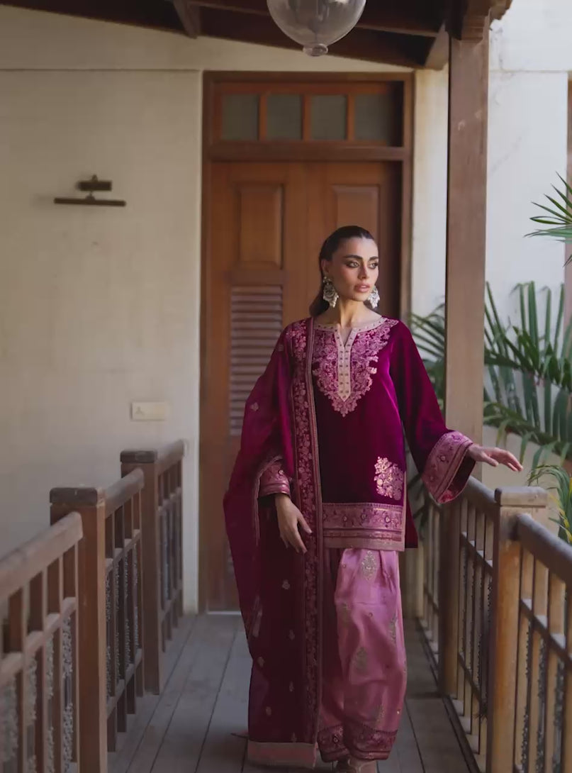 A festive unstitched outfit featuring a rich Maroon Velvet shirt with heavy traditional Zardozi and thread work concentrating on the neckline and borders. It is beautifully contrasted with a Blush Pink Raw Silk Shalwar adorned with scattered motifs. The look is completed with a graceful Maroon Organza Dupatta featuring a heavily embroidered border.