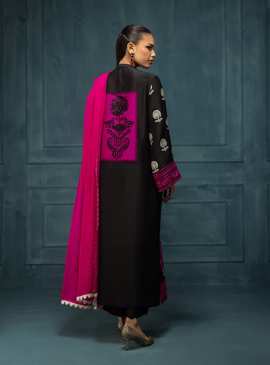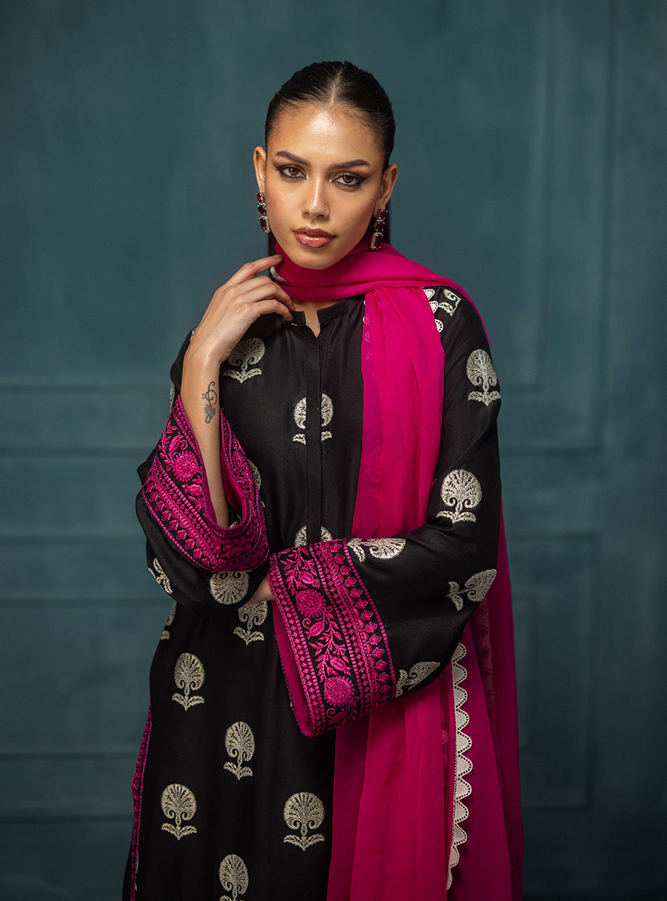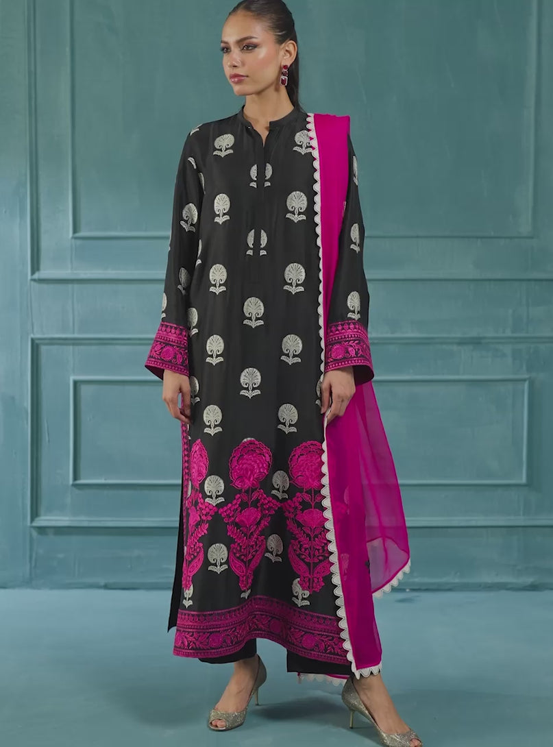 Make a powerful style statement in Ruha, a breathtaking ensemble crafted from luxurious raw silk. The classic black canvas is brought to life with striking hot pink embroidery, featuring intricate floral bunches along the border and a magnificent floral motif on the back. The look is beautifully completed by a soft pink dupatta, adorned with its own delicate black floral motif, adding a layer of depth and sophistication. This outfit is the perfect blend of traditional craftsmanship and modern flair.