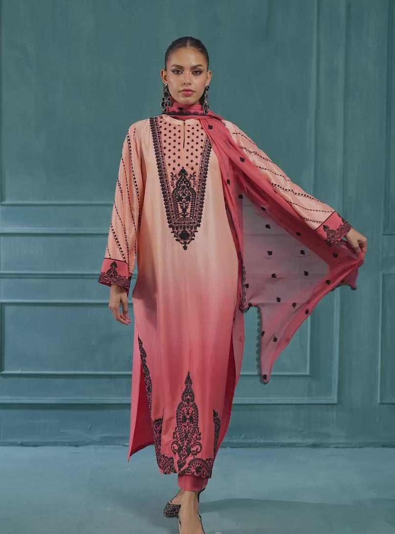 Saha is a captivating three-piece ensemble crafted from luxurious raw silk. This stunning outfit features a unique ombré transition from soft peach to vibrant coral, creating a breathtaking visual effect. The shirt is exquisitely adorned with intricate black embroidery, detailing the elegant V-neckline and extending in delicate patterns across the sleeves. A magnificent, large motif graces the back, adding an element of surprise and intricate artistry. The ensemble is completed with a flowing peach chiffon dupatta, subtly embellished with black floral embroidery.