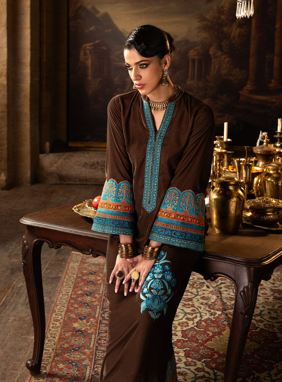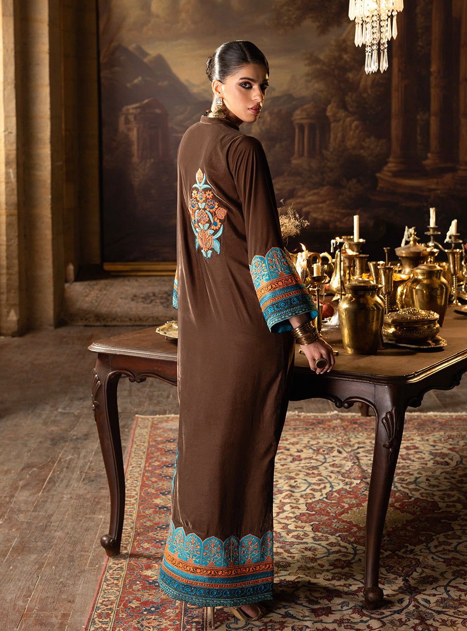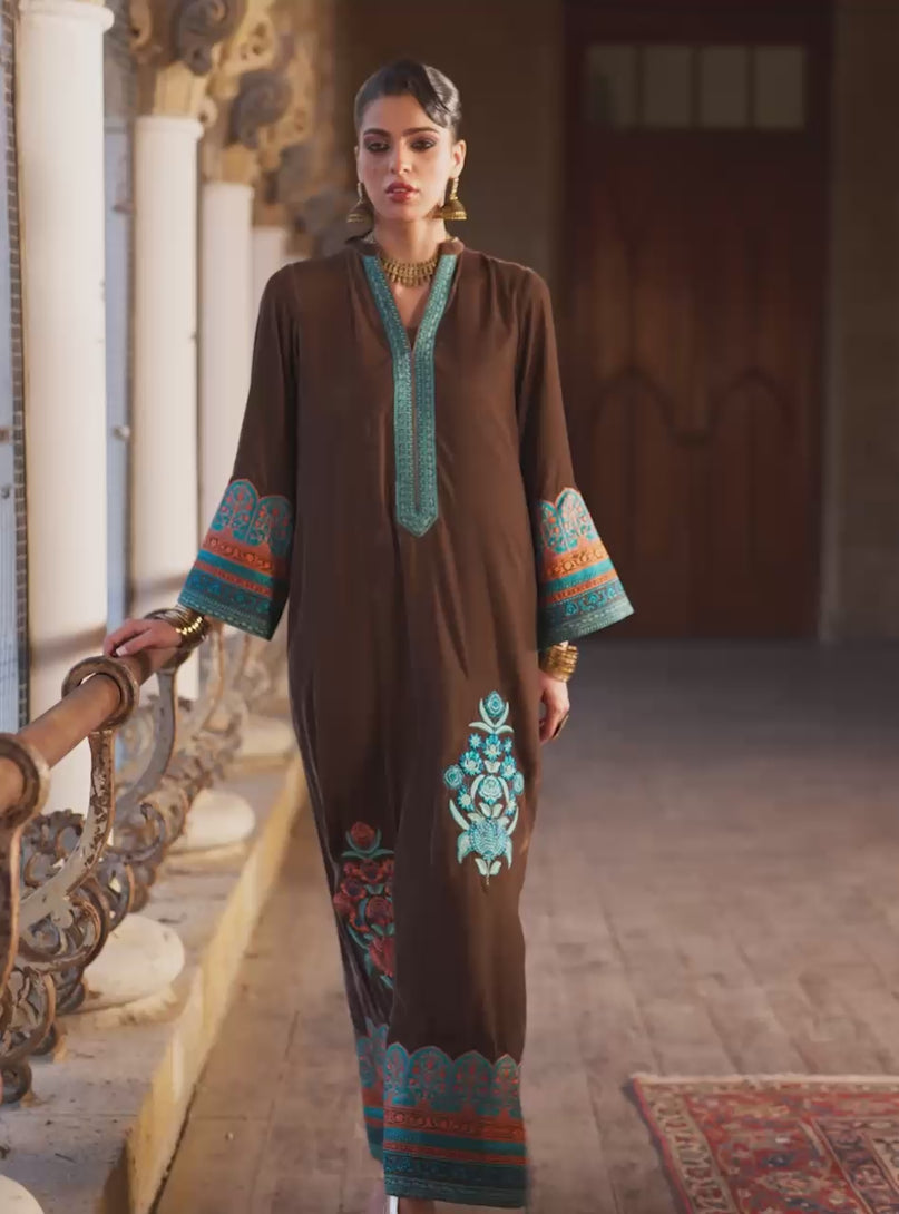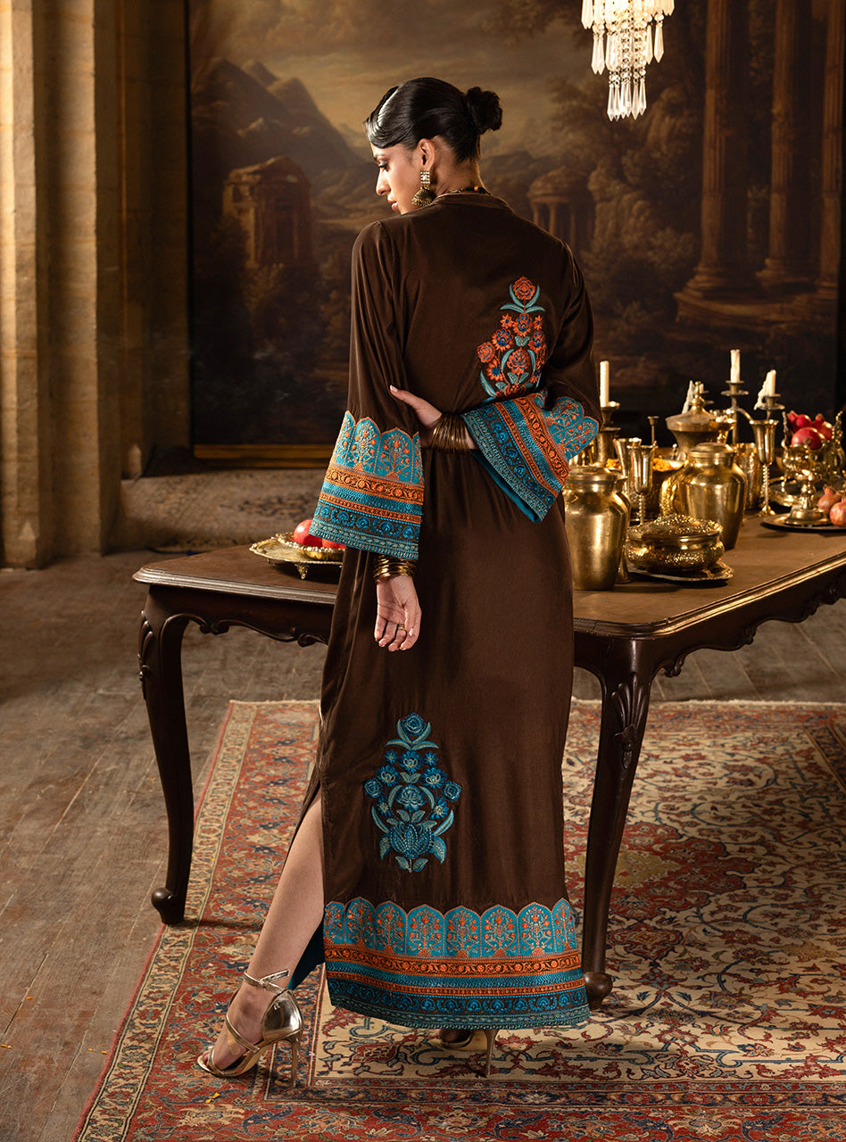 Experience the relaxed luxury of Sienna Kaftan, a kaftan that truly allows you to move with effortless grace while looking impeccably put-together. Cut from soft, draping Brown Velvet, this piece feels like a comforting embrace, blending warmth with high fashion. The drama lies in the contrasting Teal, Blue, and Rust embroidery that boldly defines the neckline, cuffs, and sweeping side panels, giving the kaftan a vibrant, modern edge.