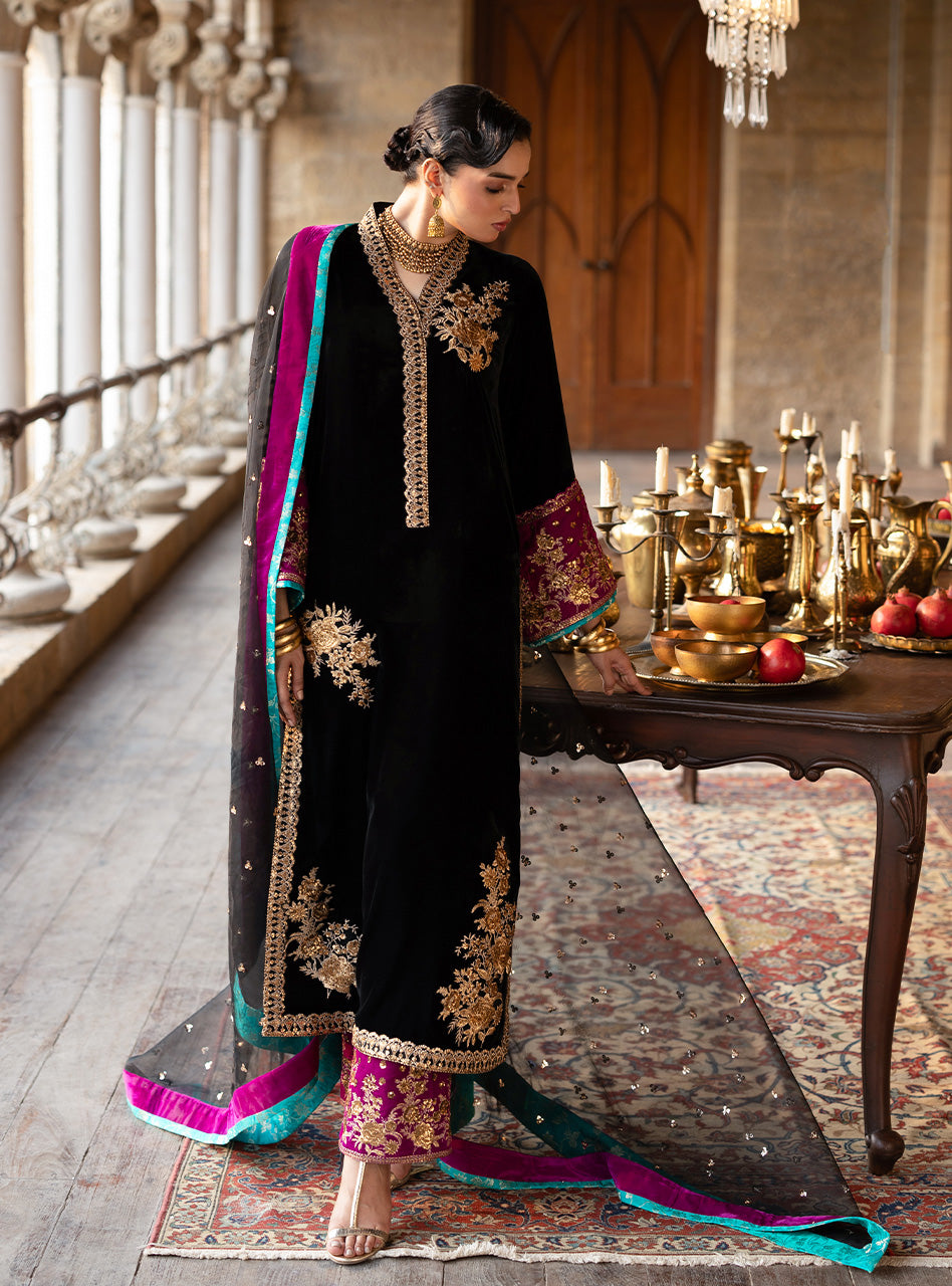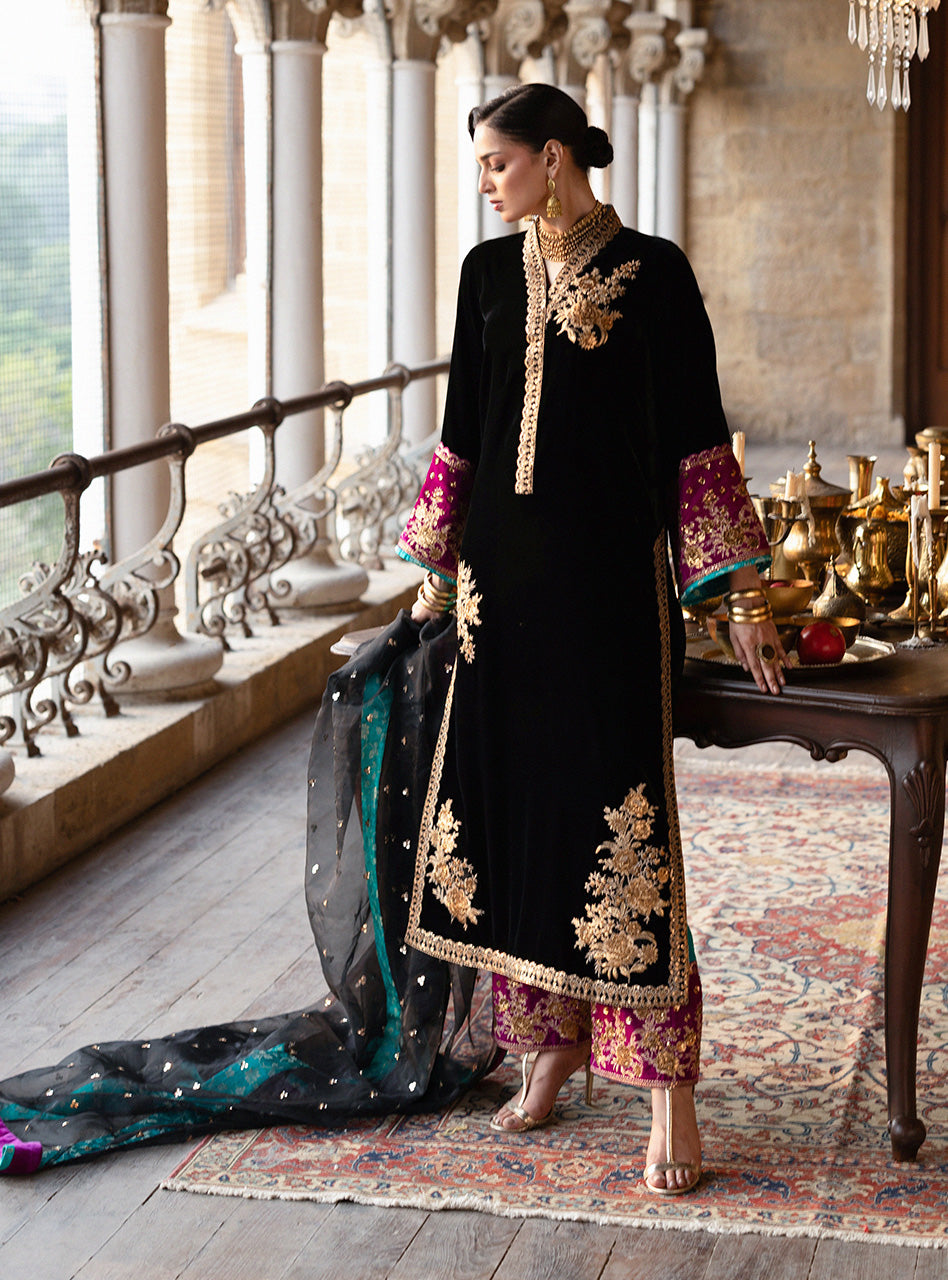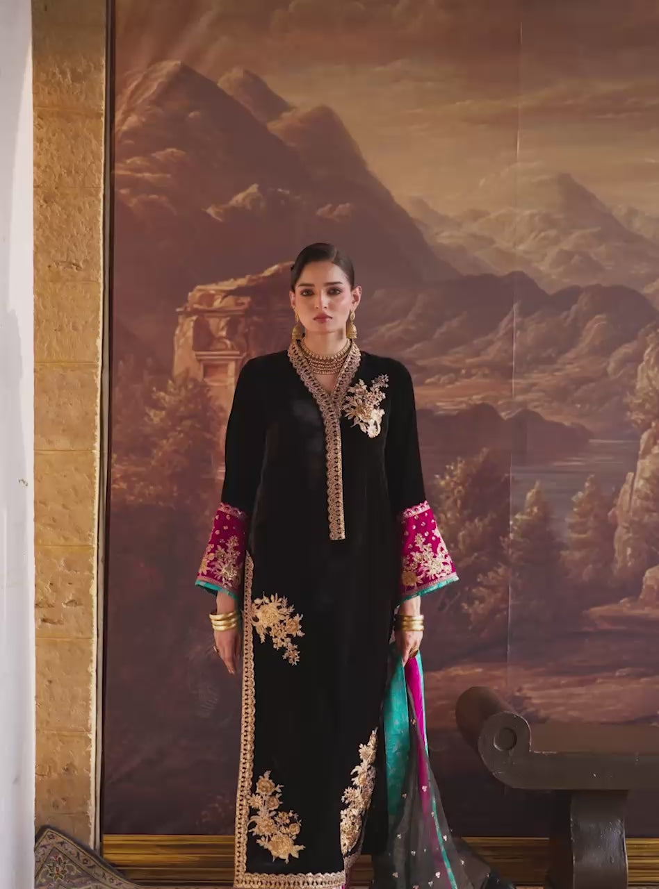 This long, straight-cut kurta is a canvas for intricate gold tilla embroidery, which lavishly embellishes the neckline, front, and forms magnificent floral motifs on the cuffs and hem. The back is graced with a striking large-scale gold design, while the cuffs feature a vibrant magenta velvet border with rich gold work. It is dramatically paired with a teal with magenta border pants, beautifully adorned with matching gold embroidery along its cuffs, and completed by a sheer black organza dupatta with bold magenta and teal velvet borders, scattered with delicate gold accents.