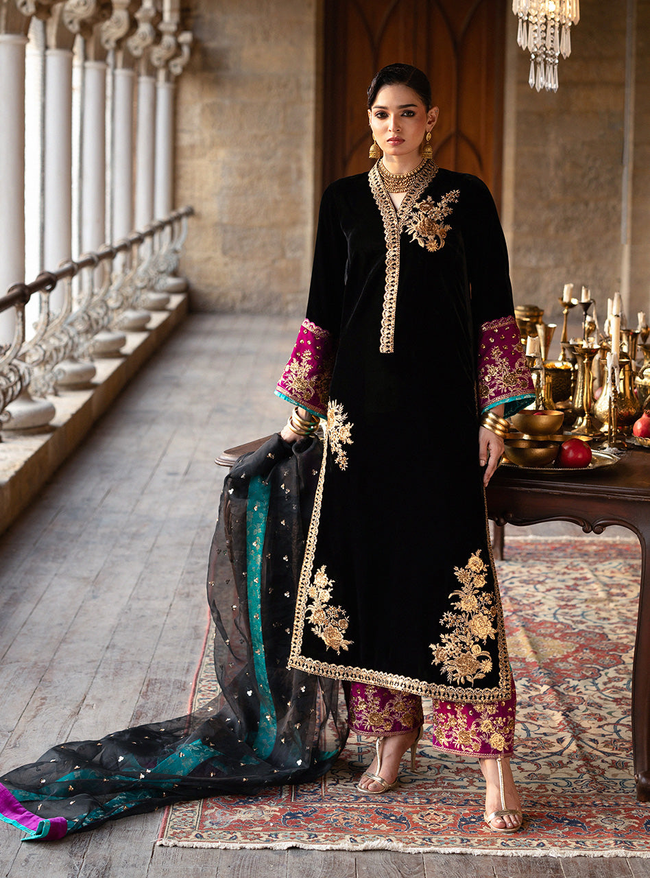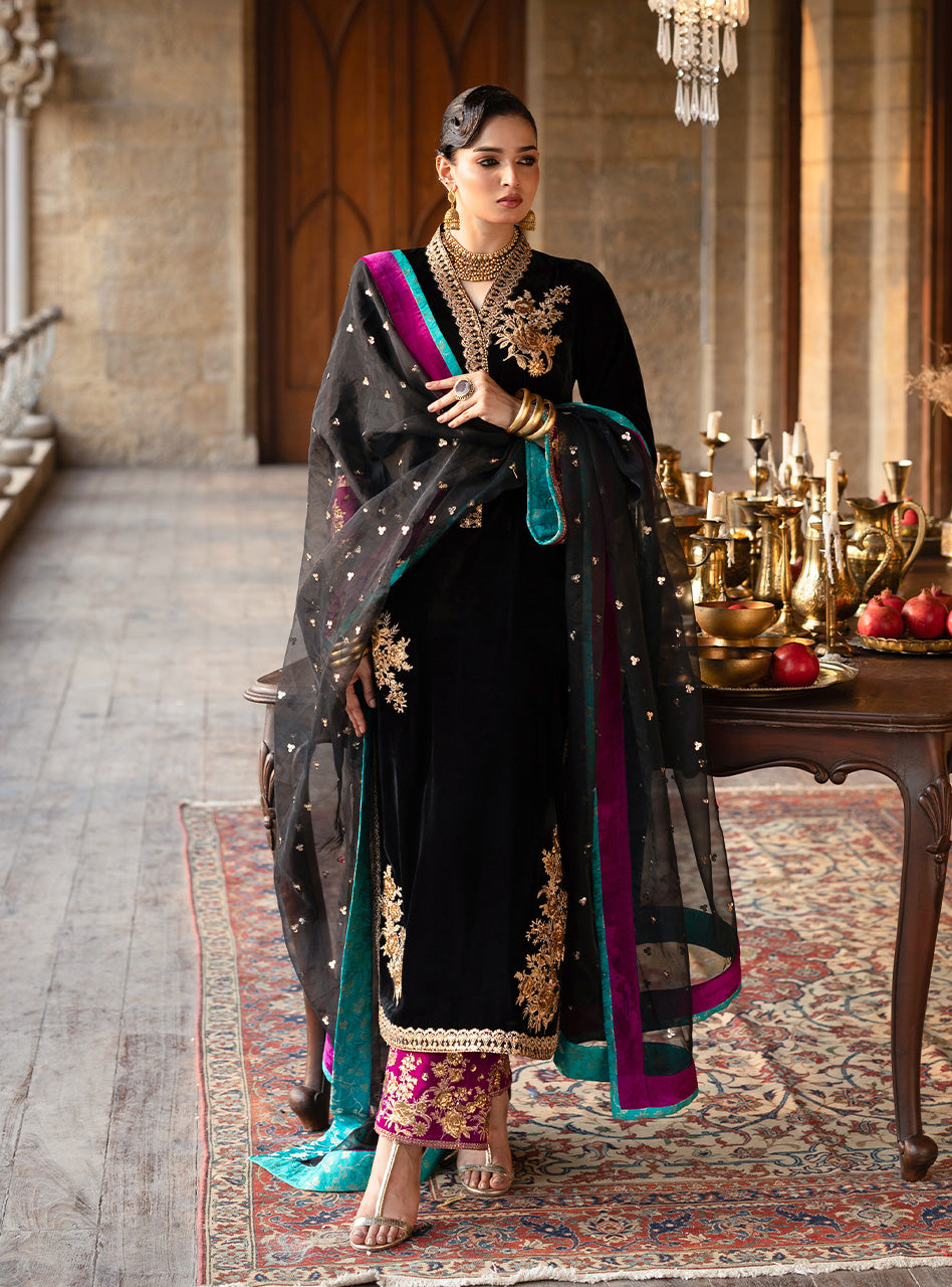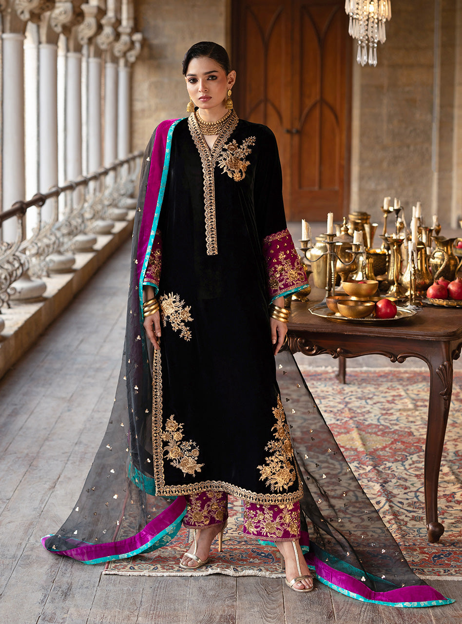 This long, straight-cut kurta is a canvas for intricate gold tilla embroidery, which lavishly embellishes the neckline, front, and forms magnificent floral motifs on the cuffs and hem. The back is graced with a striking large-scale gold design, while the cuffs feature a vibrant magenta velvet border with rich gold work. It is dramatically paired with a teal with magenta border pants, beautifully adorned with matching gold embroidery along its cuffs, and completed by a sheer black organza dupatta with bold magenta and teal velvet borders, scattered with delicate gold accents.