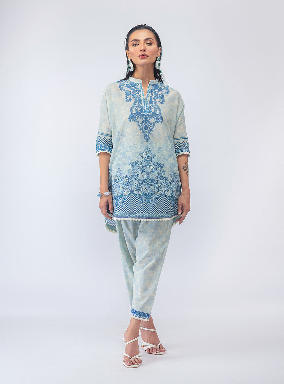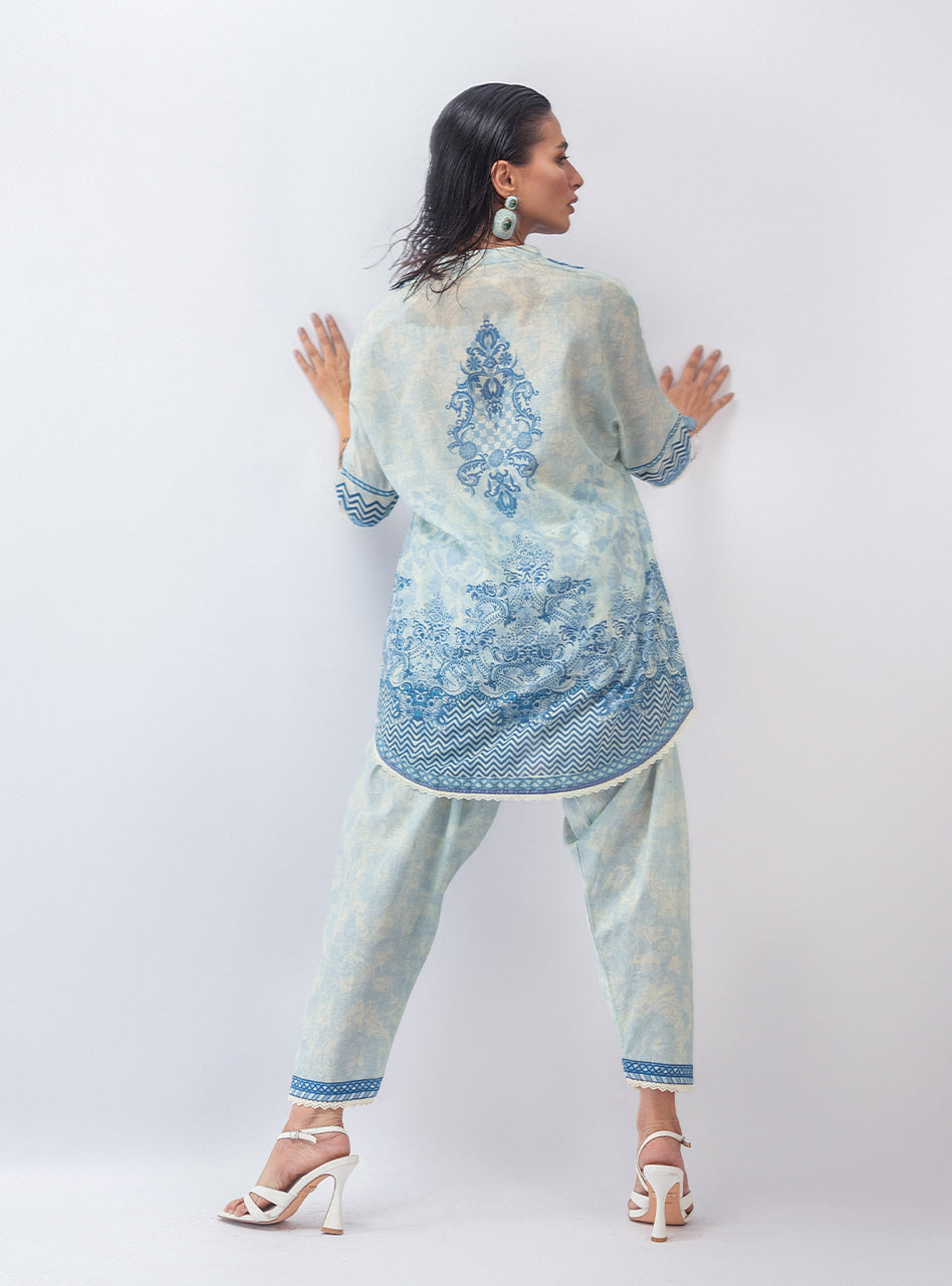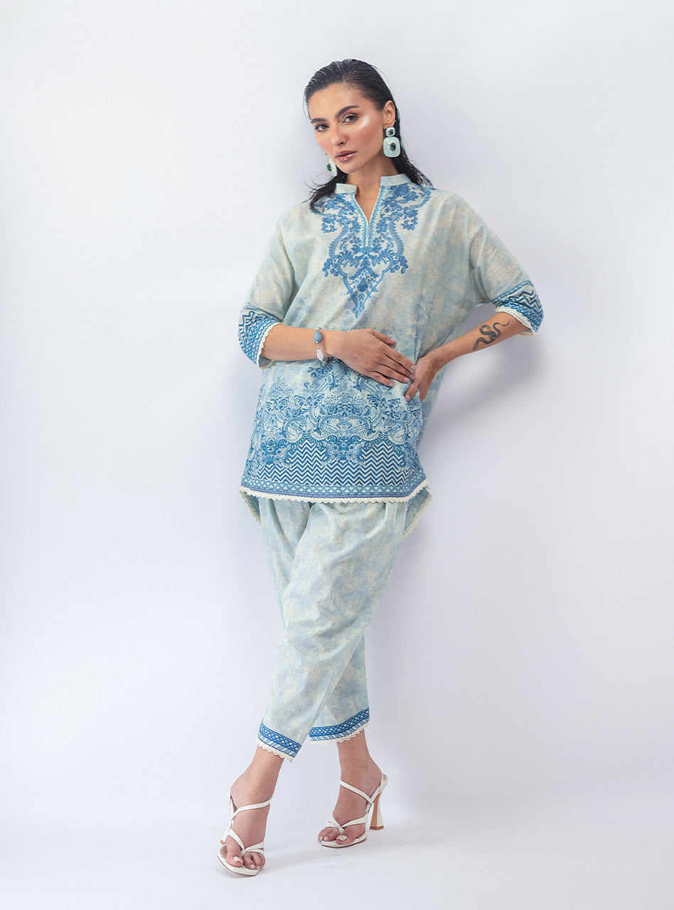 This whole vibe is serving major artsy energy, with a dark, moody black base that lets the vibrant, intricate print pop. The flowy short shirt and matching shalwar are a perfect combo of comfortable and cool, making this set your go-to for effortless style. It's the kind of look that makes a statement without being extra—just pure, confident main character energy.