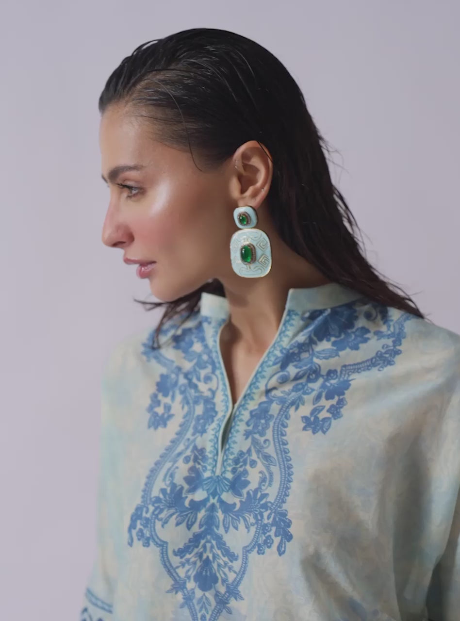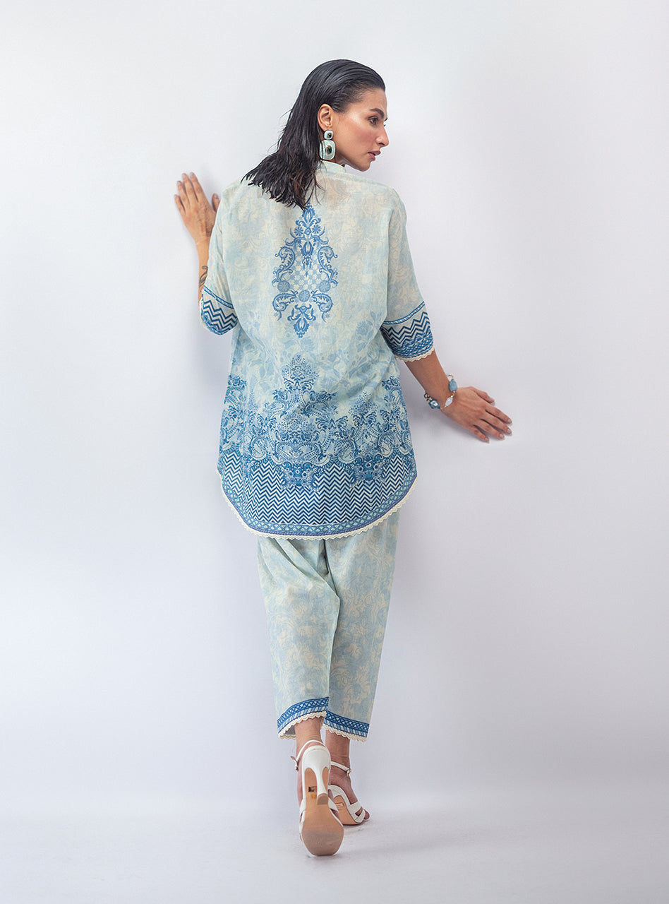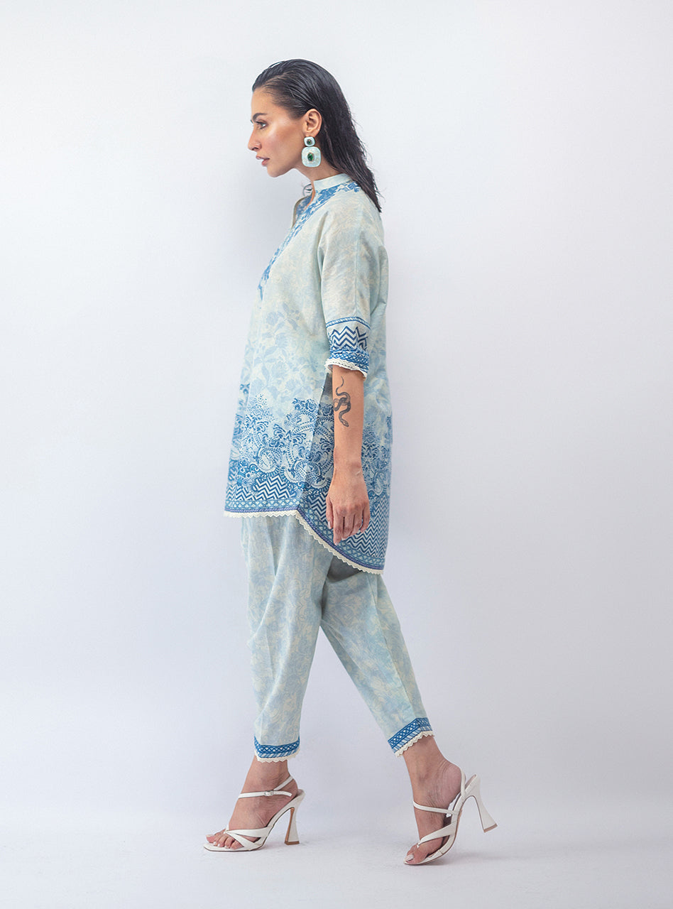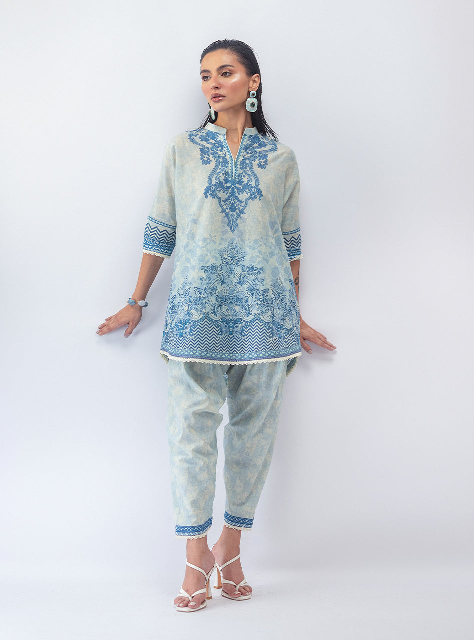 This whole vibe is serving major artsy energy, with a dark, moody black base that lets the vibrant, intricate print pop. The flowy short shirt and matching shalwar are a perfect combo of comfortable and cool, making this set your go-to for effortless style. It's the kind of look that makes a statement without being extra—just pure, confident main character energy.