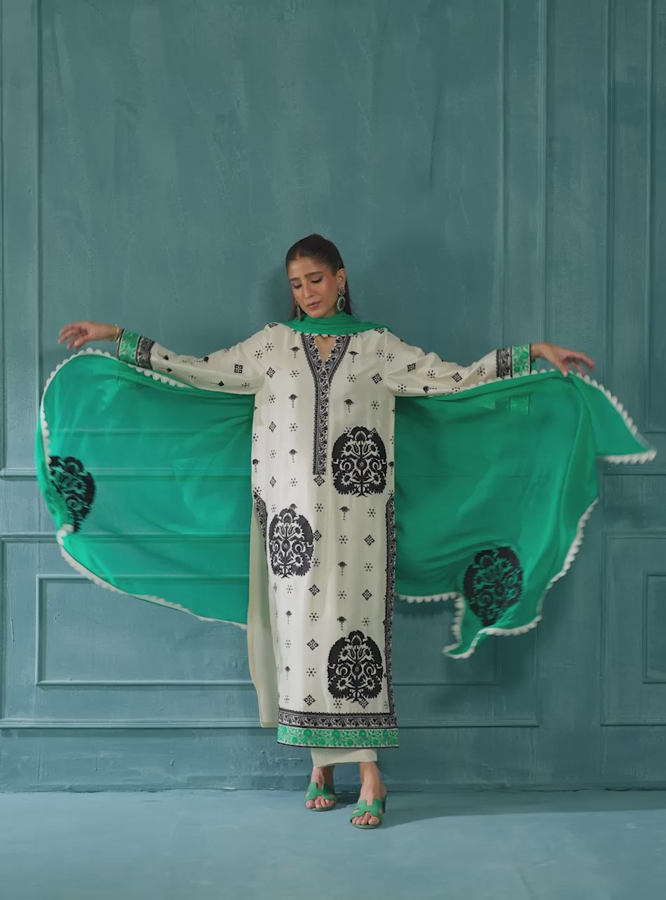 Crafted from luxurious raw silk, this stunning ivory ensemble is a timeless addition to any wardrobe. The full-length shirt features intricate black embroidery on the front, while the back reveals a breathtakingly beautiful teal tree motif, adding an element of surprise and sophistication. A delicate scattering of embroidered motifs on the sleeves and a striking teal dupatta with embroidered bunches complete this look.