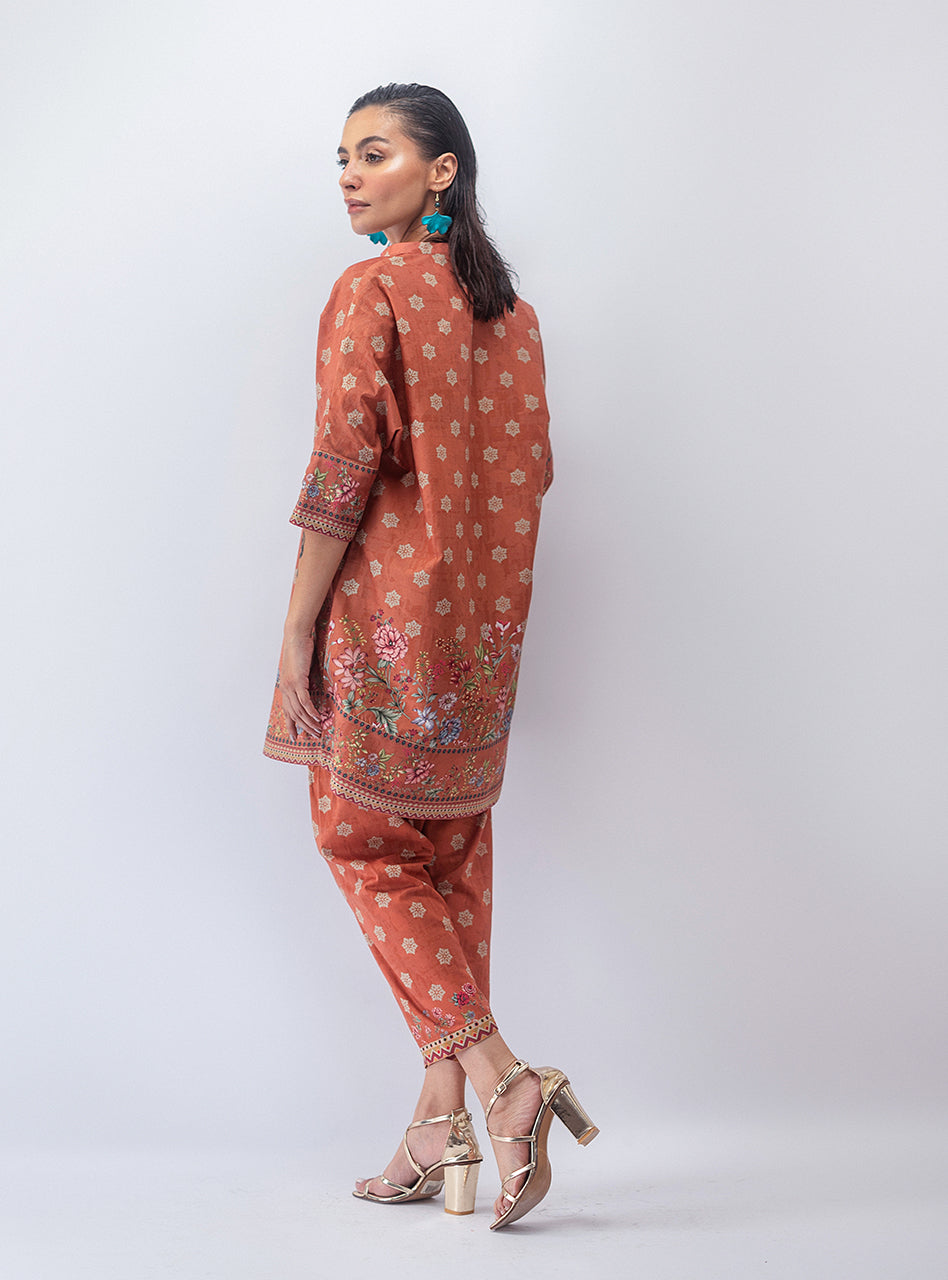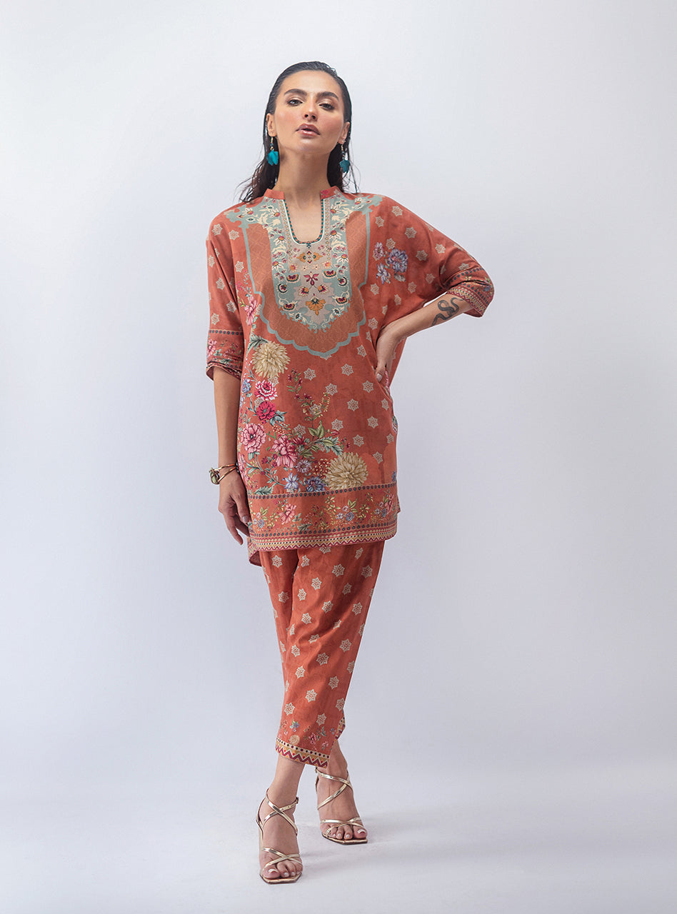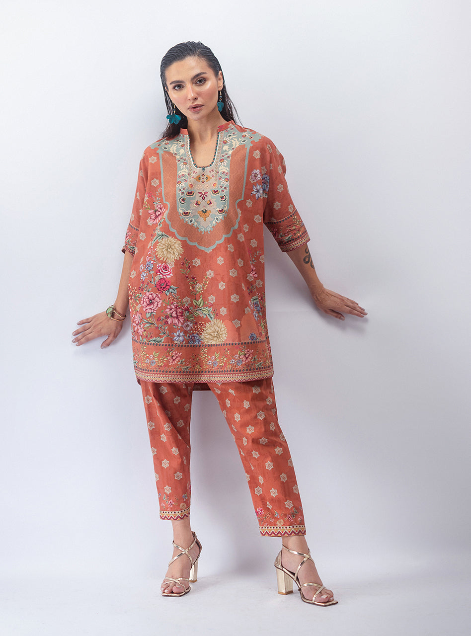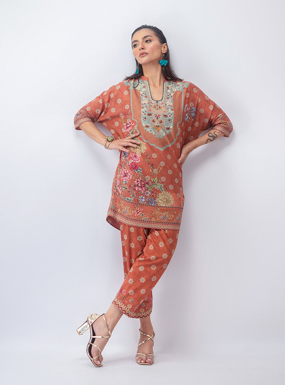 This is a whole vibe, serving major bohemian chic, with a warm, earthy rust color that's a total aesthetic. The short shirt and matching shalwar are covered in a beautiful, intricate floral print that's giving all the artsy feels. It's the perfect mix of comfortable and cool, making it your go- to for effortless style. This set is a total moment, ready to make any day feel like a magical sunset.