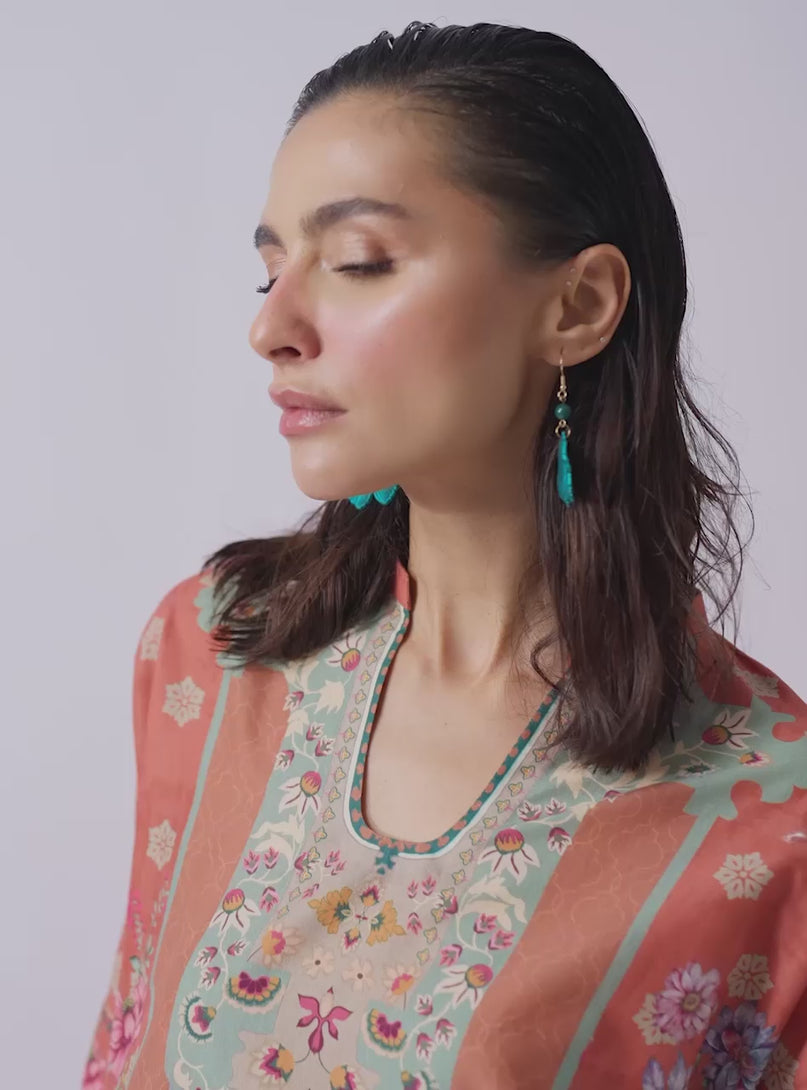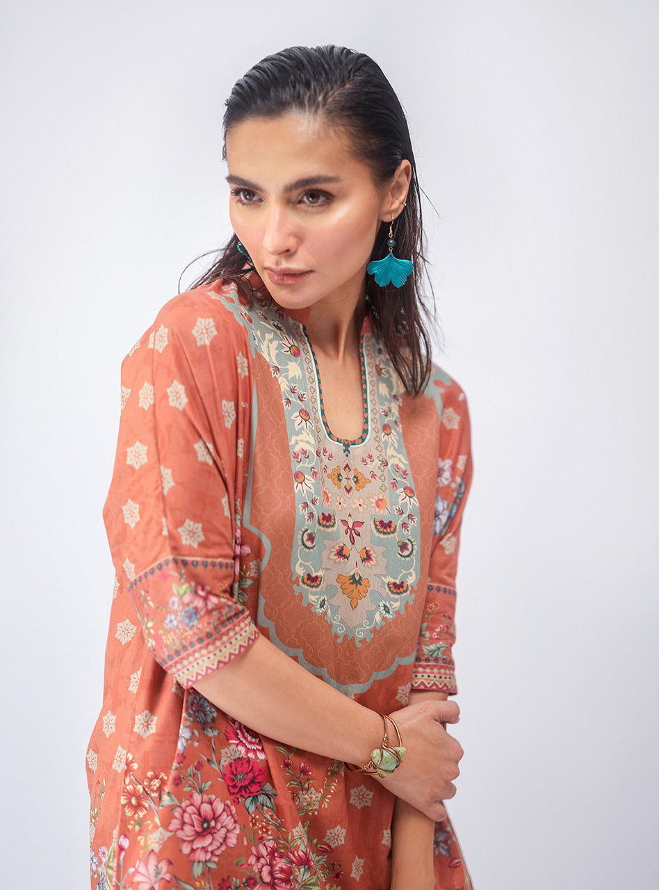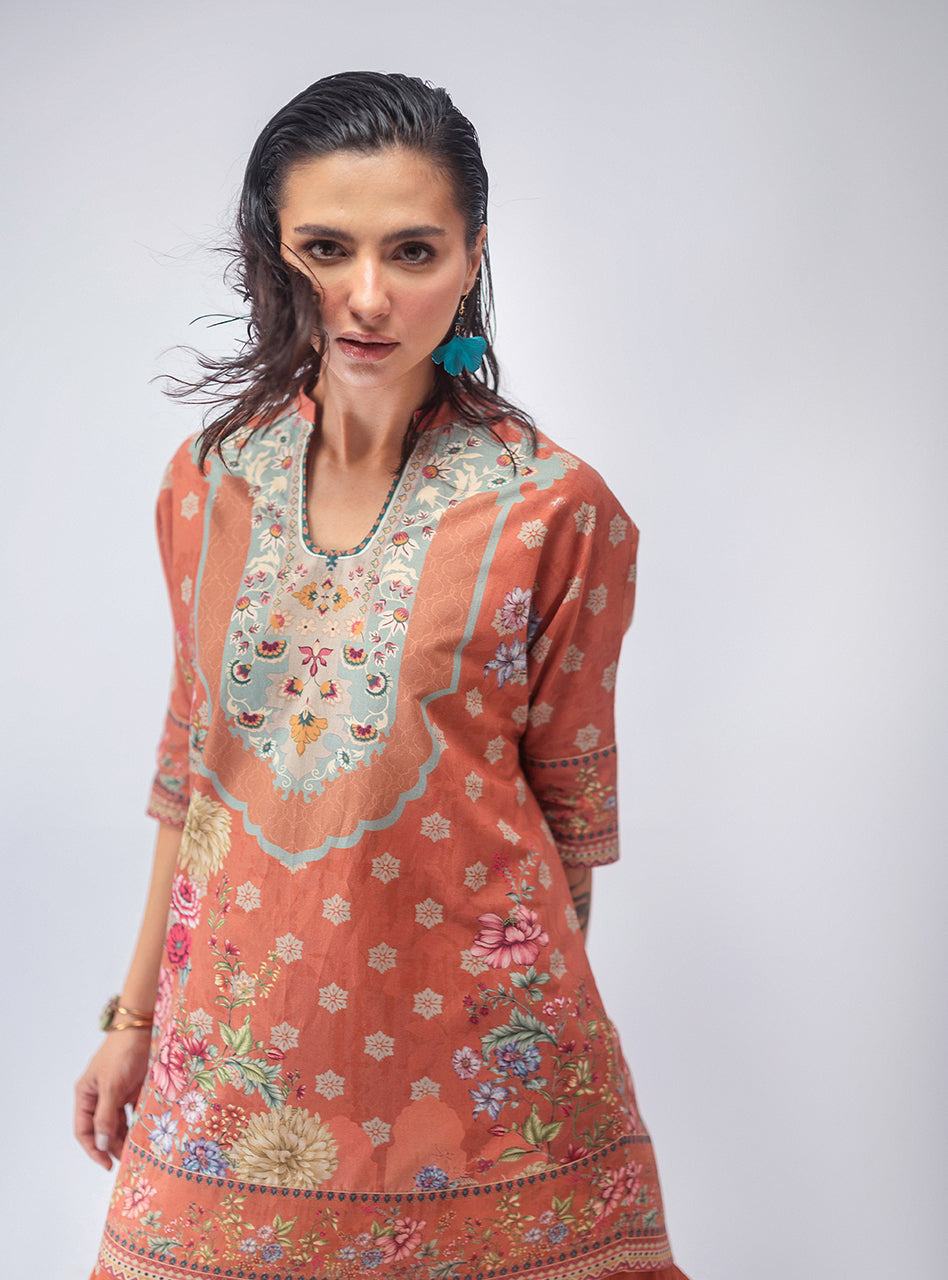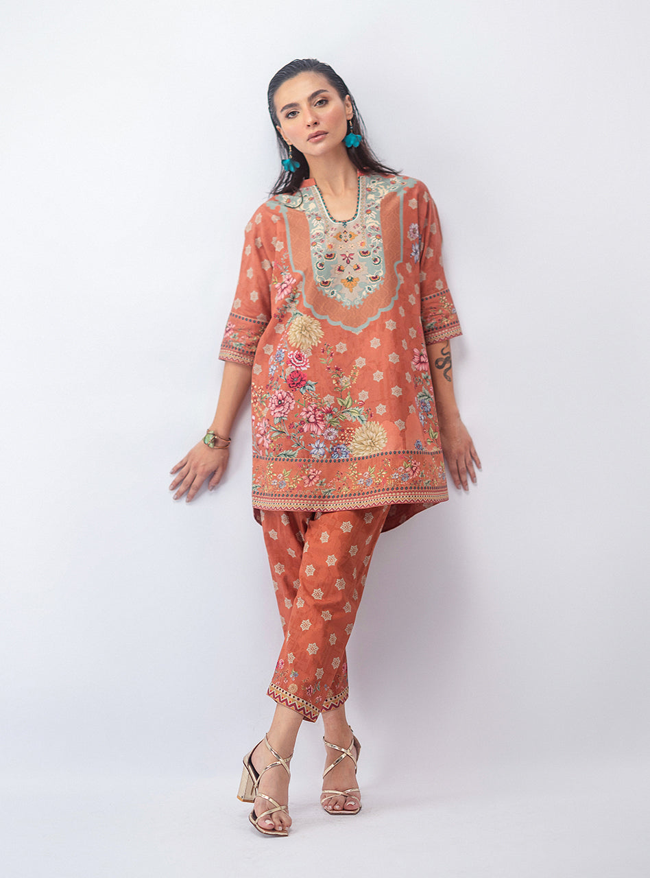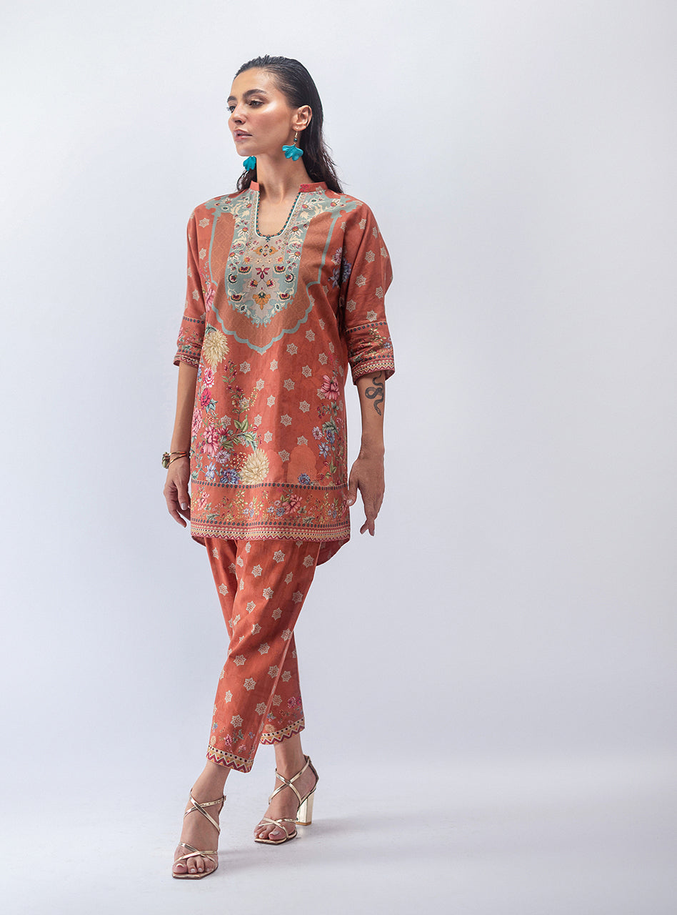 This is a whole vibe, serving major bohemian chic, with a warm, earthy rust color that's a total aesthetic. The short shirt and matching shalwar are covered in a beautiful, intricate floral print that's giving all the artsy feels. It's the perfect mix of comfortable and cool, making it your go- to for effortless style. This set is a total moment, ready to make any day feel like a magical sunset.